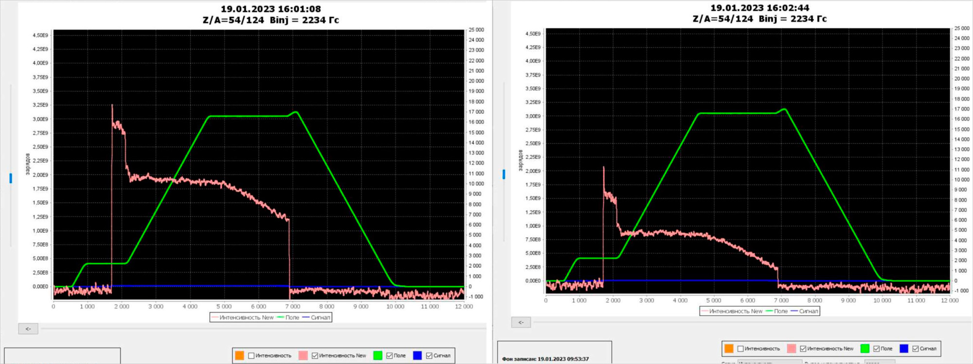 Влияние на интенсивность пучка в Нуклотроне — с охлаждением интенсивность больше