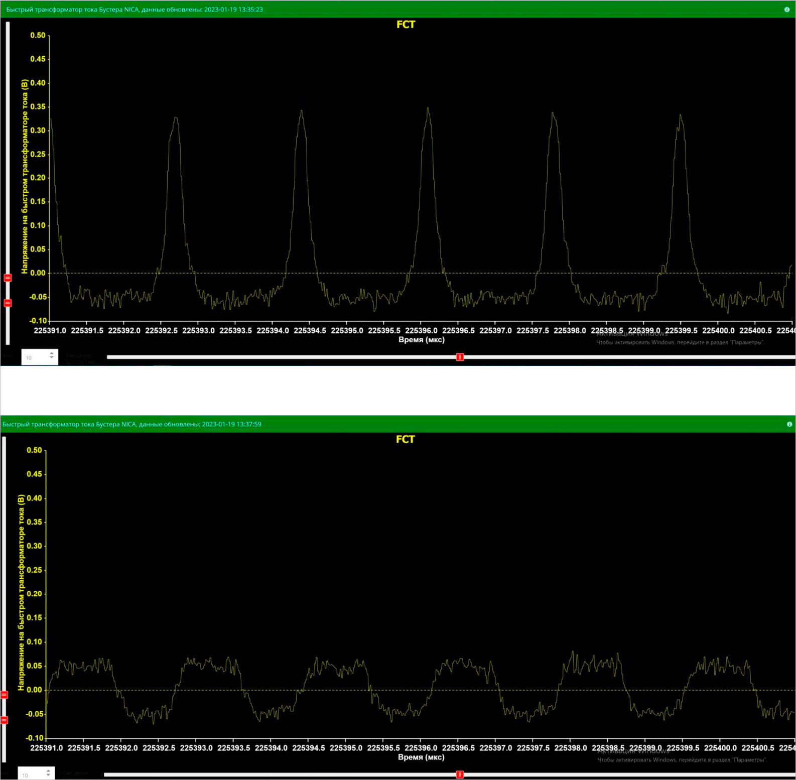 Данные с быстрого трансформатора тока Бустера (пояс Роговского) с охлаждением и без