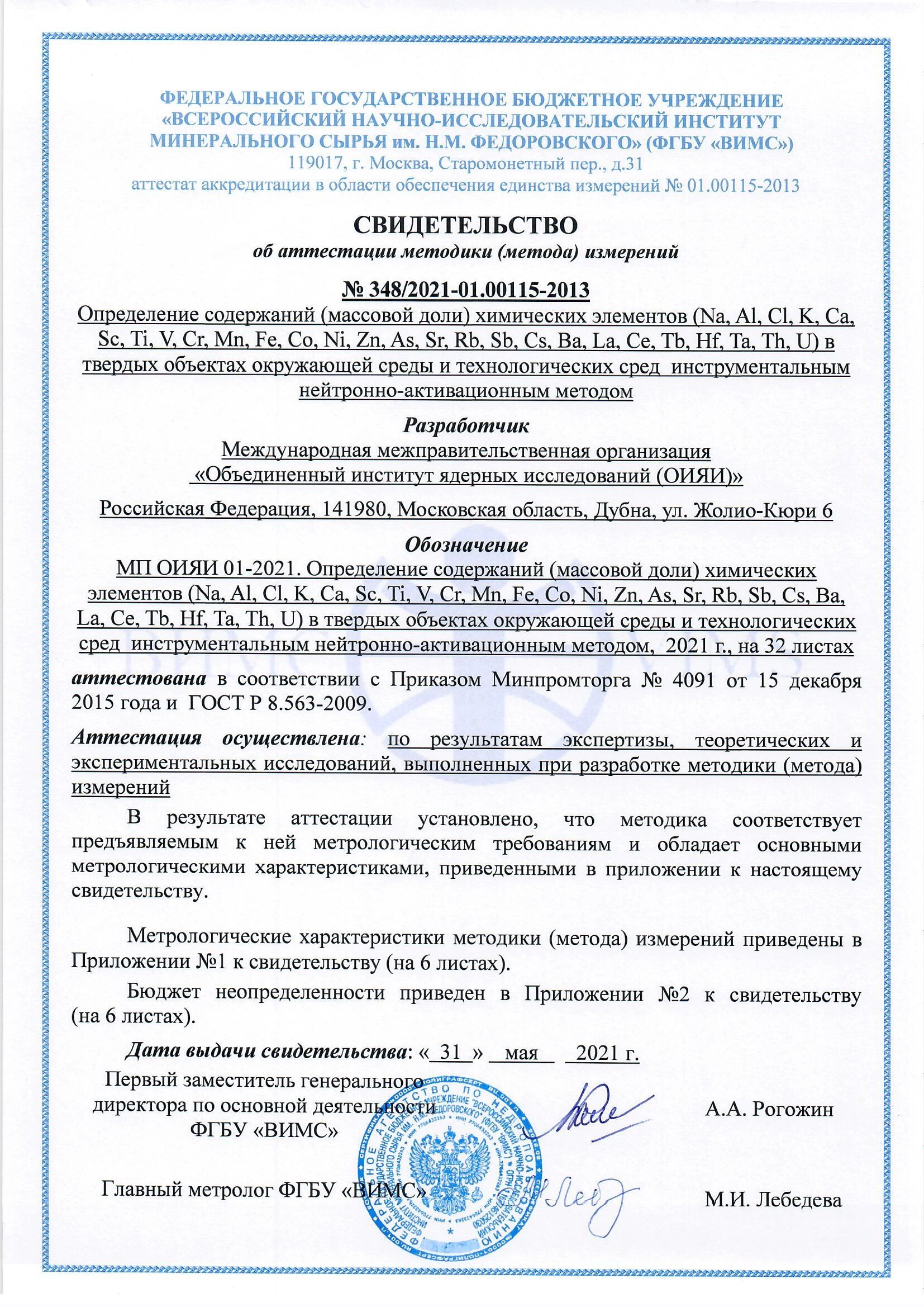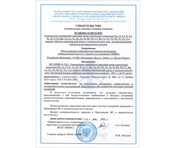 The methodology of determining the content of chemical elements by neutron activation analysis at the REGATA facility of the IBR-2 reactor has been certified. The All-Russian Scientific-Research Institute of Mineral Resources n.a. N. M. Fedorovsky has issued a corresponding document.