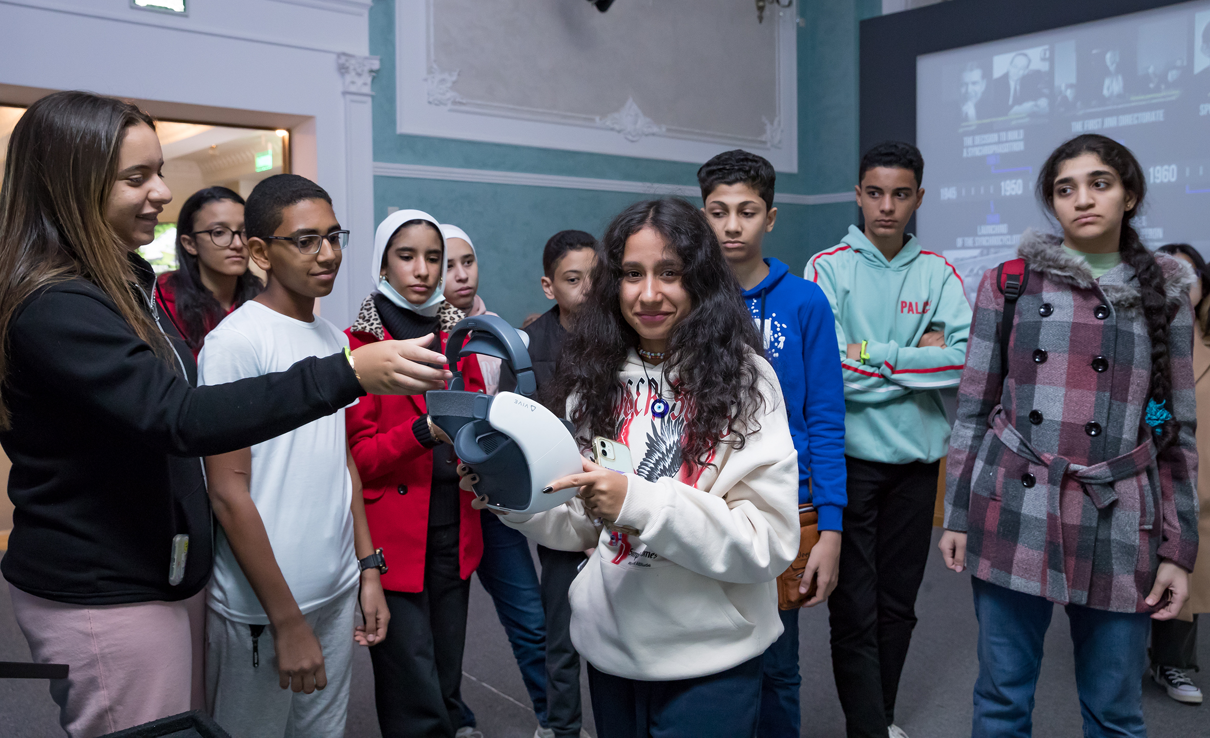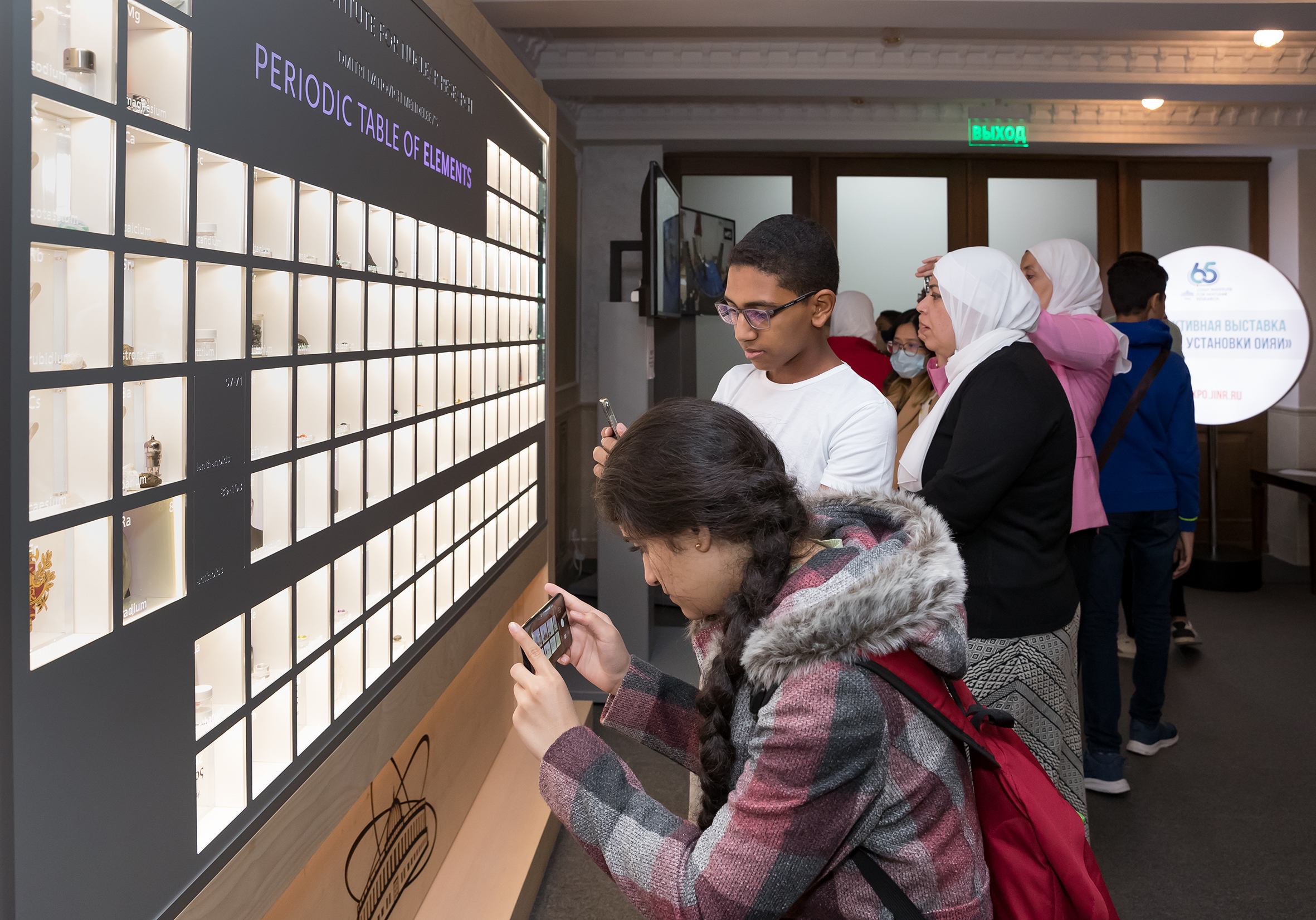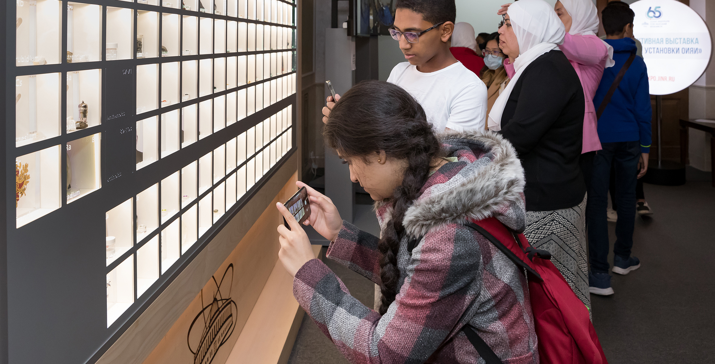 Программа мероприятия стартовала на интерактивной выставке ОИЯИ, посвященной базовым установкам Института. Участников и их кураторов с египетской стороны поприветствовал заместитель директора Учебно-научного центра Александр Верхеев. На выставке инженер-программист ЛФВЭ Никита Сидоров познакомил ребят с историей Института и рассказал о его научных направлениях.