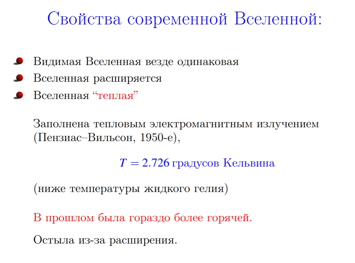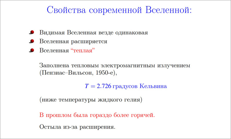 Что мы знаем о видимой Вселенной сегодня? Она выглядит изотропной (одинаковой) на больших масштабах, но неоднородна на маленьких. Пространство расширяется, растягивается во все стороны, но при этом какого-то специального, выделенного места в нем нет. В прошлом Вселенная расширялась гораздо быстрее, а в будущем она станет более разреженной.