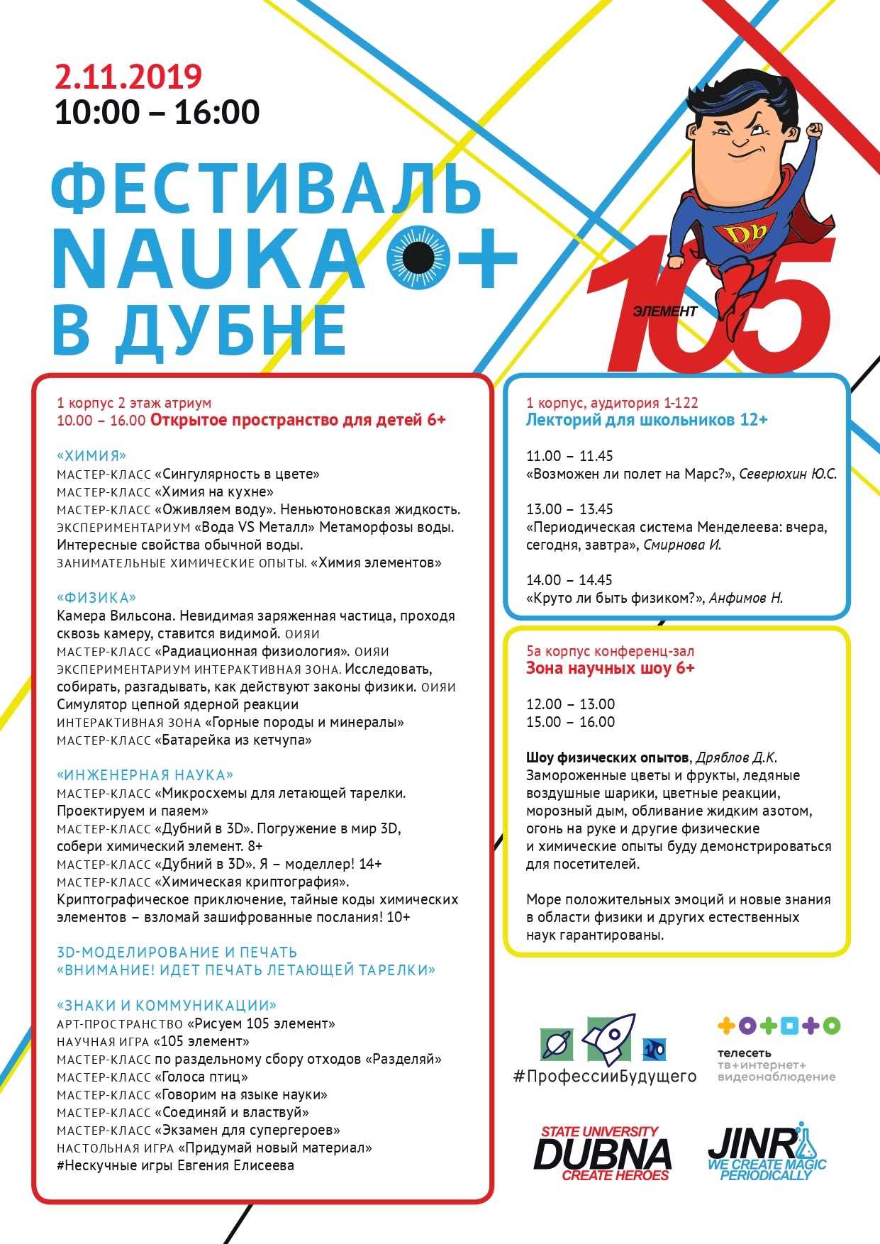 2 ноября 2019 года с 10:00 до 16:00 Университет «Дубна» совместно с Объединенным институтом ядерных исследований откроет в Дубне региональную площадку Всероссийского фестиваля науки NAUKA 0+.