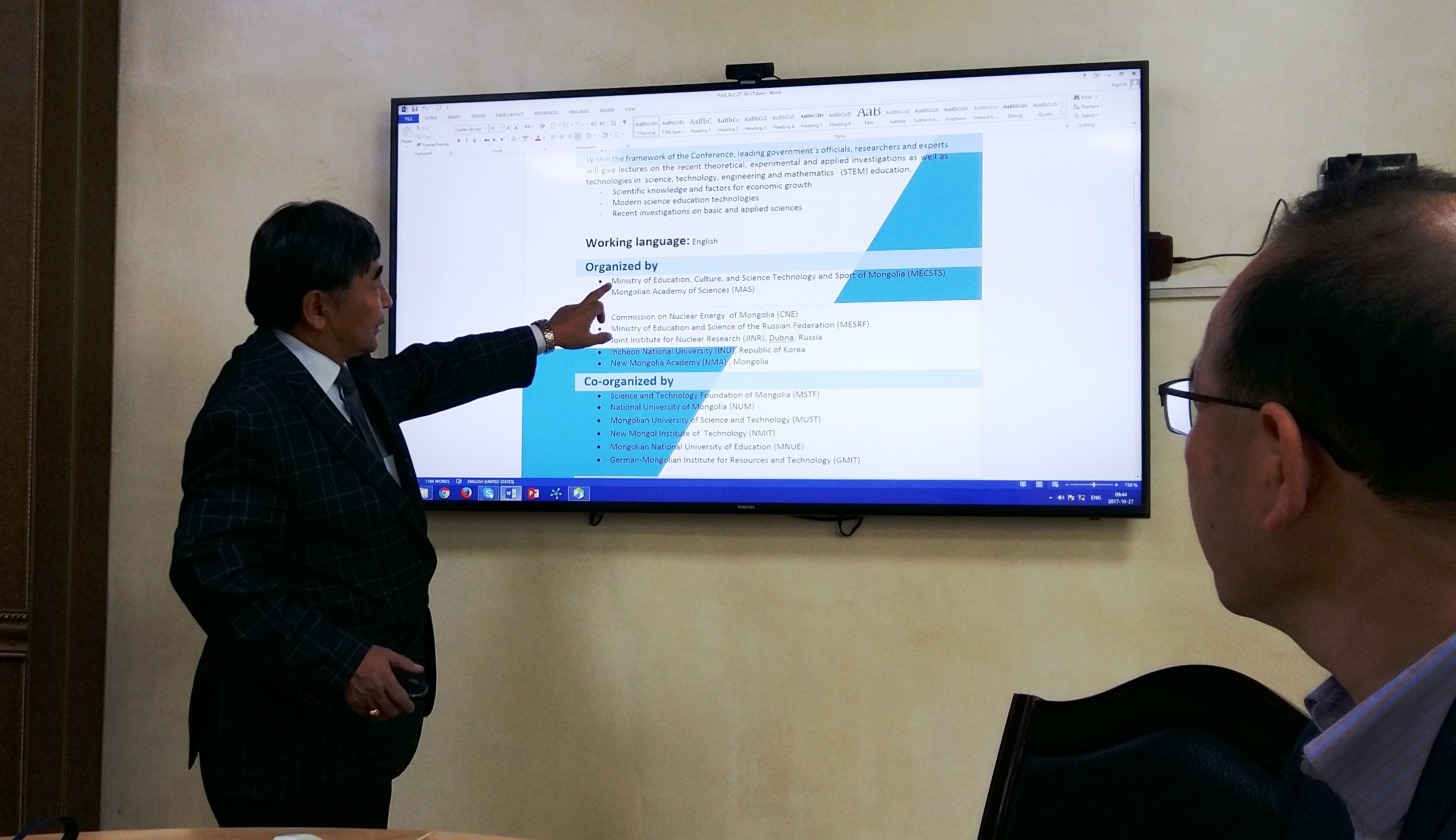 Заседание оргкомитета конференции, предварительно озаглавленной «Современные тенденции в естественных науках и передовые технологии в естественно-научном образовании», прошло в Институте физики и технологии Академии наук Монголии (АНМ). В обсуждении комплекса организационных вопросов и тематики конференции участвовали как видные ученые, монгольские академики, а также и молодые ученые — члены локального оргкомитета. Участники заседания договорились завершить предварительную подготовку и анонсировать детали конференции до 20 ноября 2017.