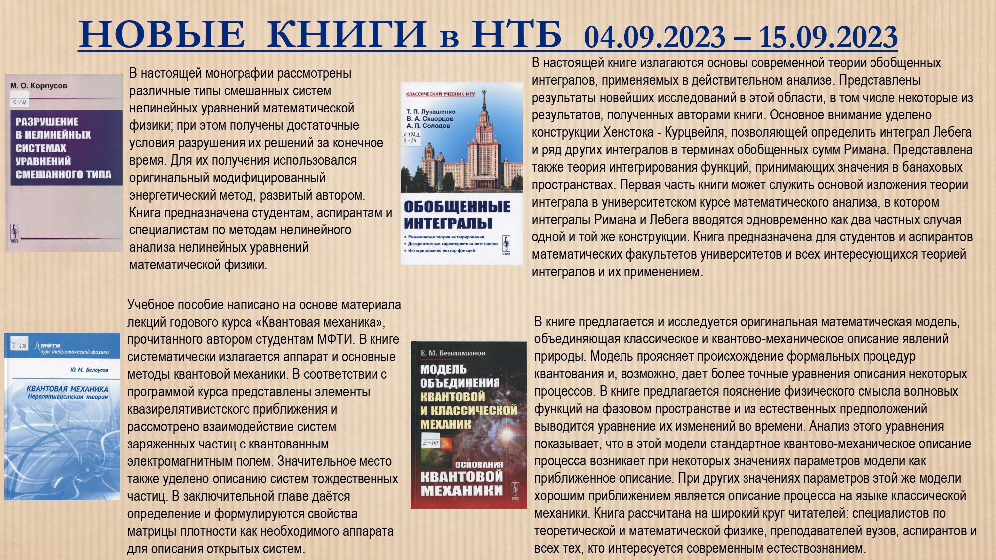 On 4 – 15 September 2023, the JINR Science and Technology Library (S&T Library) invites visitors to the New Book Acquisitions exhibition. Readers are offered educational and scientific literature that will be interesting for students, postgraduates, teachers, and researchers.