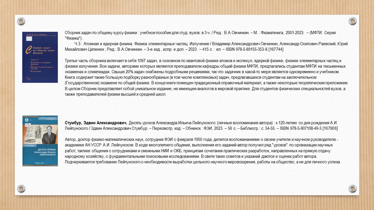 • the memoir genre represented by fragments of notes from a JINR researcher Anatoly Sidorin and personal memories of Edwin Stumbur about his teacher and scientific supervisor, academician Alexander Leipunsky.