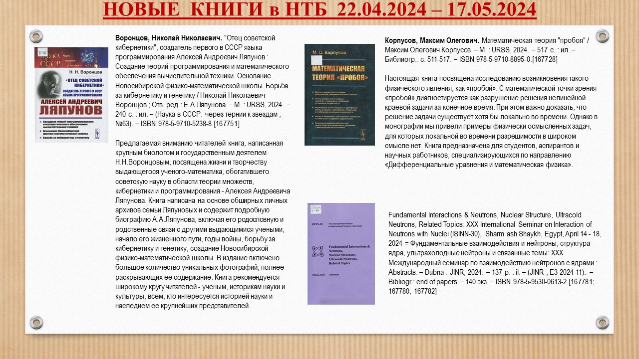 From 22 April to 17 May 2024, the JINR Science and Technology Library invites visitors to the New Book Acquisitions exhibition.