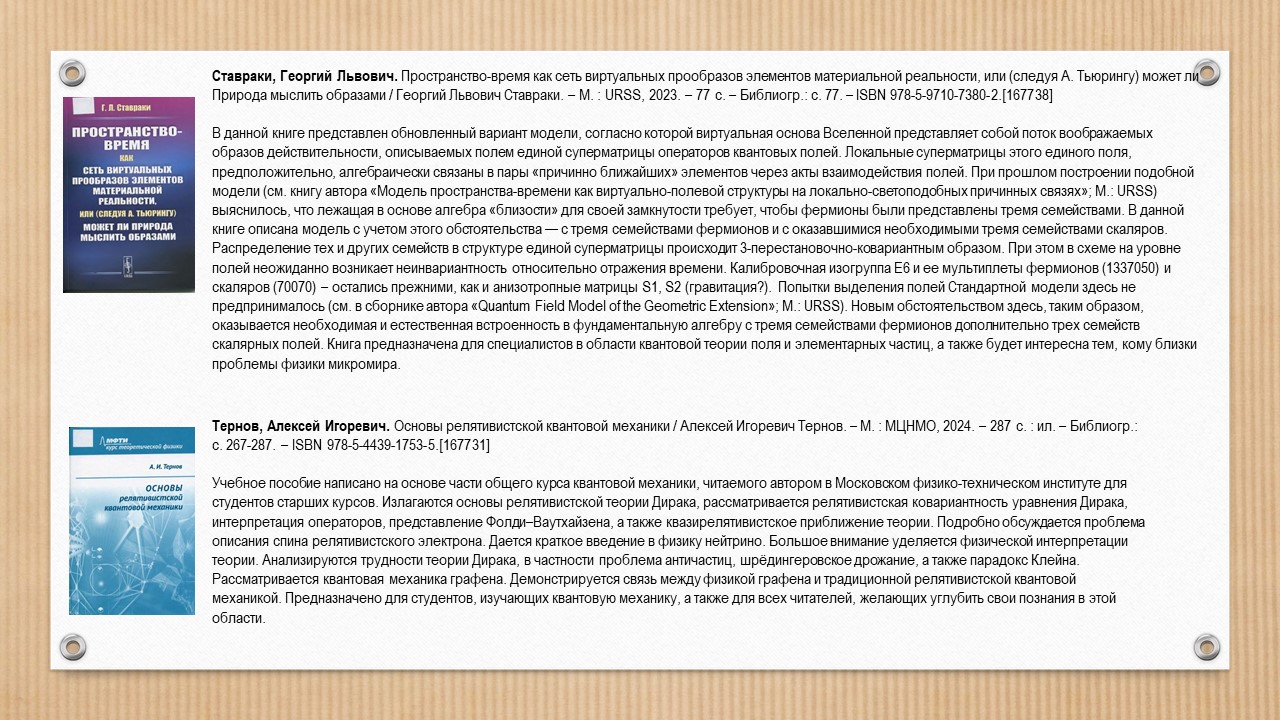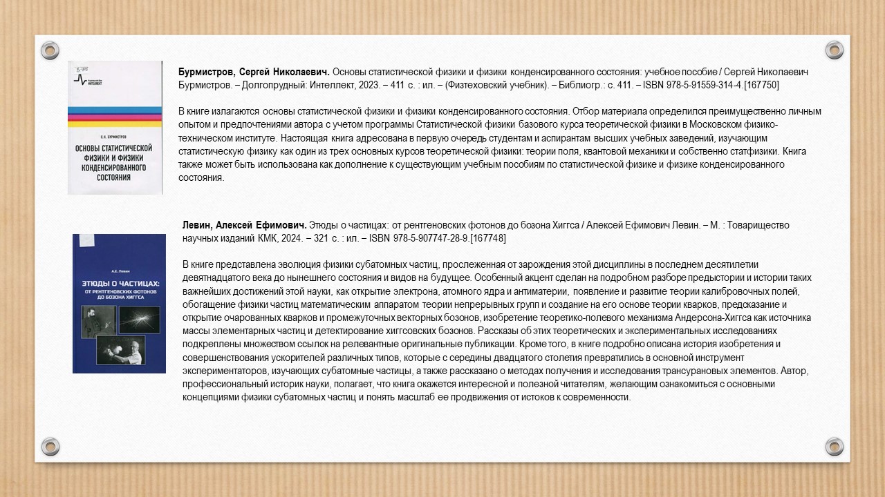 - monographs on the synthesis of elements in the Universe, on the physics of subatomic particles from the origin of the discipline to its current state and prospects, on quantum mechanics, mathematical statistics, and condensed matter physics.