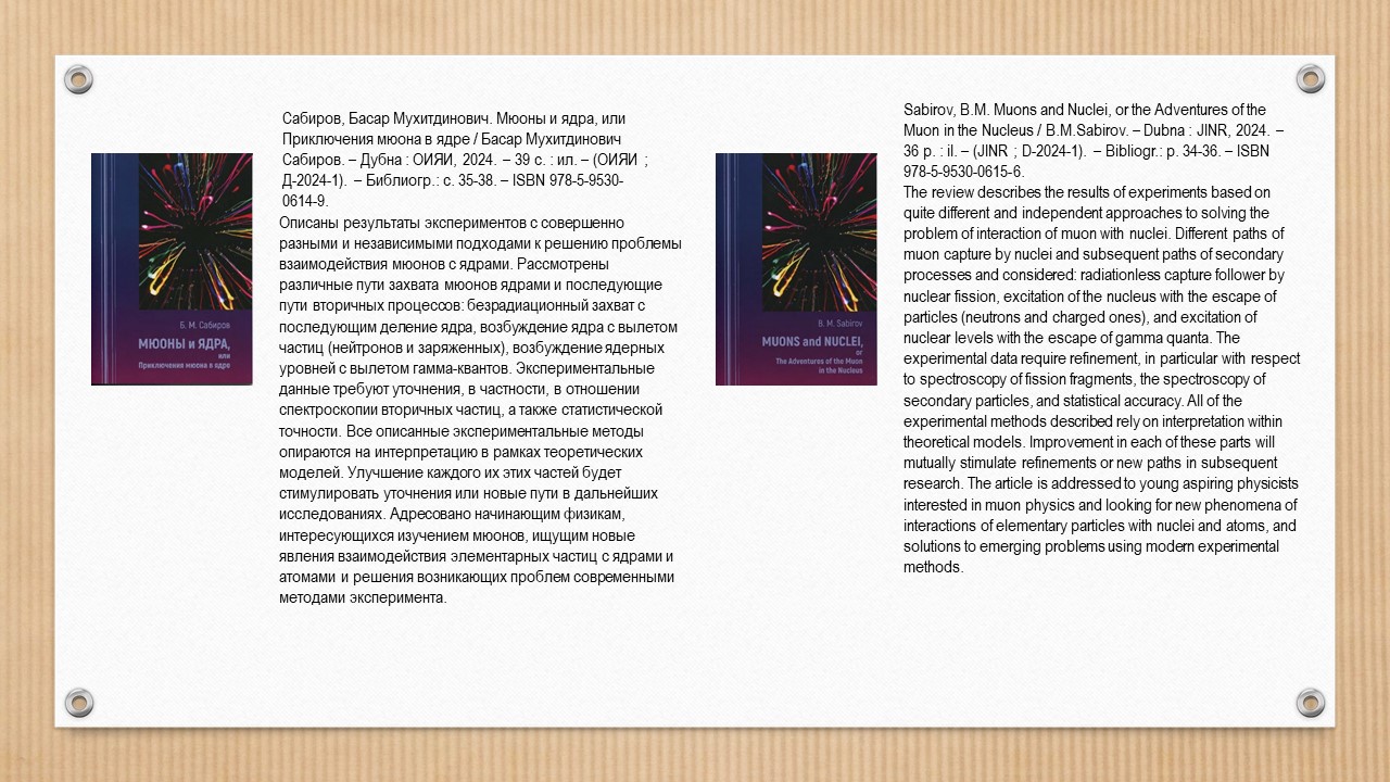 - two books about muons and the nucleus by JINR researcher Basar M. Sabirov, in Russian and English for beginners in physics;