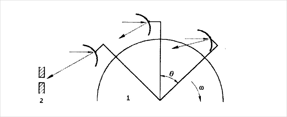 Fig. 2. The device implementing the claimed method of producing cold and ultracold neutrons with parabolic diffraction mirrors attached to the bracket using hinges. At any moment, each of several mirrors focuses reflected neutrons on the entrance slit of the trap designed to store UCN. (1) – the mirror rotation system, (2) – the entrance slit of the trap for UCN