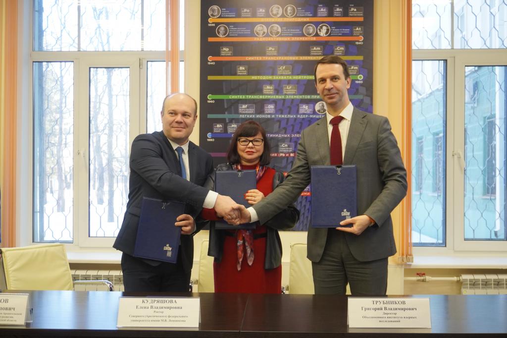 On 18 March 2022, a festive opening ceremony of the Information Centre of the Joint Institute for Nuclear Research at the Northern (Arctic) Federal University named after M. V. Lomonosov (NArFU) took place. Representatives of the JINR Directorate headed by JINR Director RAS Academician Grigory Trubnikov and leading scientists of the Joint Institute arrived in Arkhangelsk to take part in the opening ceremony of the JINR Information Centre.