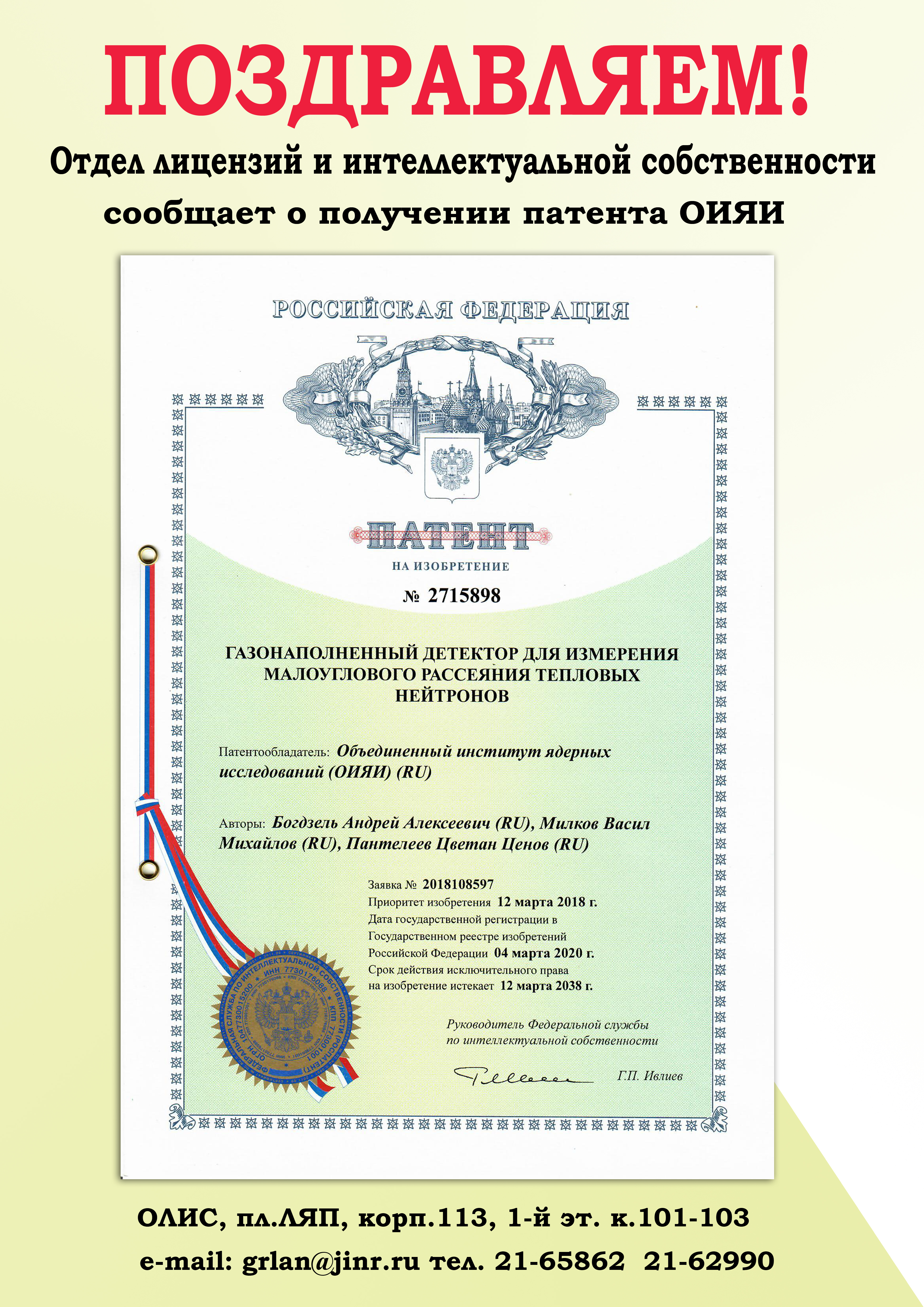 JINR staff congratulates the authors on receiving the patent for their invention!
