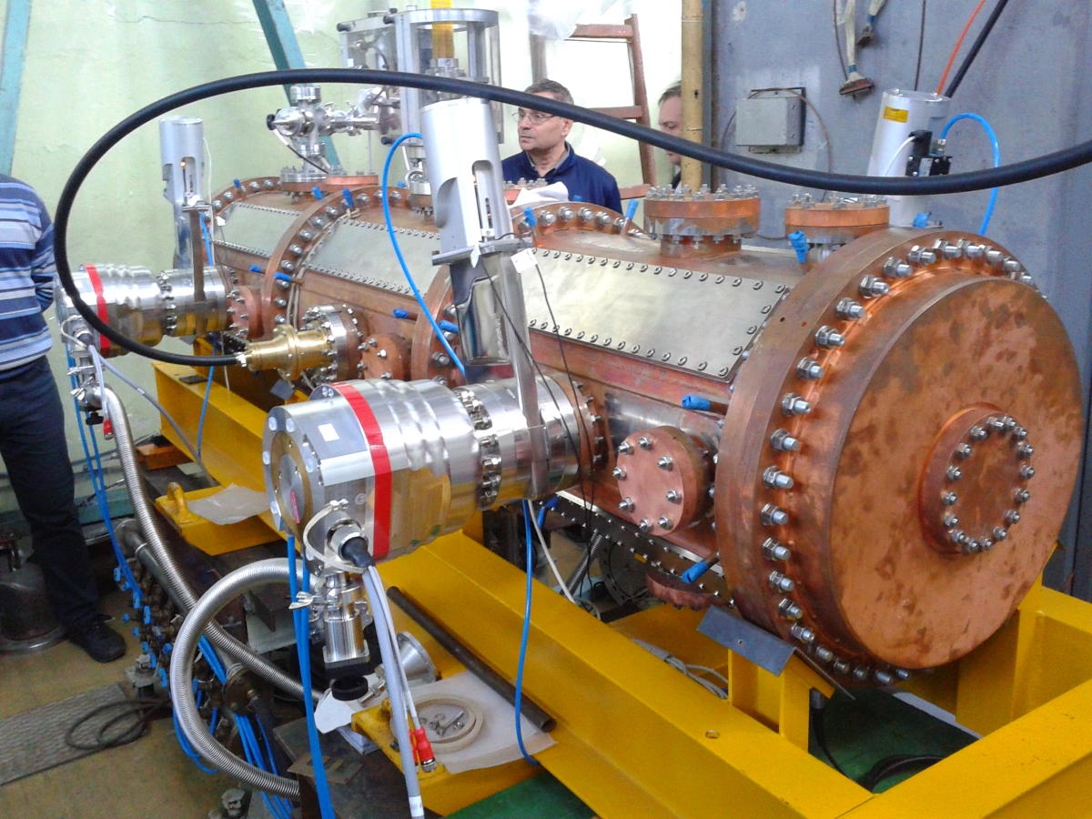 After two years of design work, engineering documentation has been prepared and a resonator of the accelerator has been made in the pilot factory of the All-Russia Research Institute of Technical Physics (Snezhinsk). A high-frequency power supply system has been also developed and made in ITEP. After manufacturing, adjustment and testing, the accelerator was transported to Dubna and installed in the “Injector Hall” of the accelerator complex “Nuclotron”. Physical launch of the new accelerator was held in December 2015.