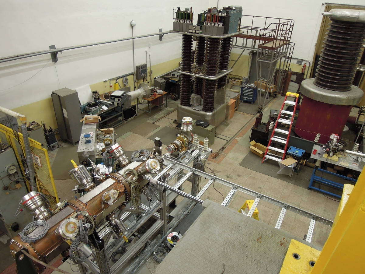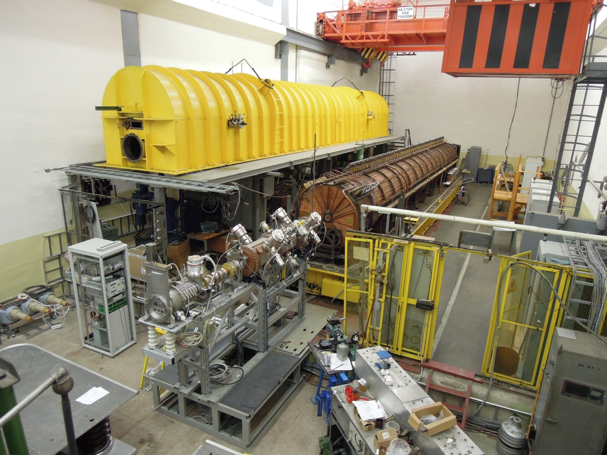 “Injector Hall” for the accelerator complex “Nuclotron” in preparation for launch: in the foreground is the new injector with a laser ion source, hereinafter – the accelerator LU-20 with removed vacuum jacket