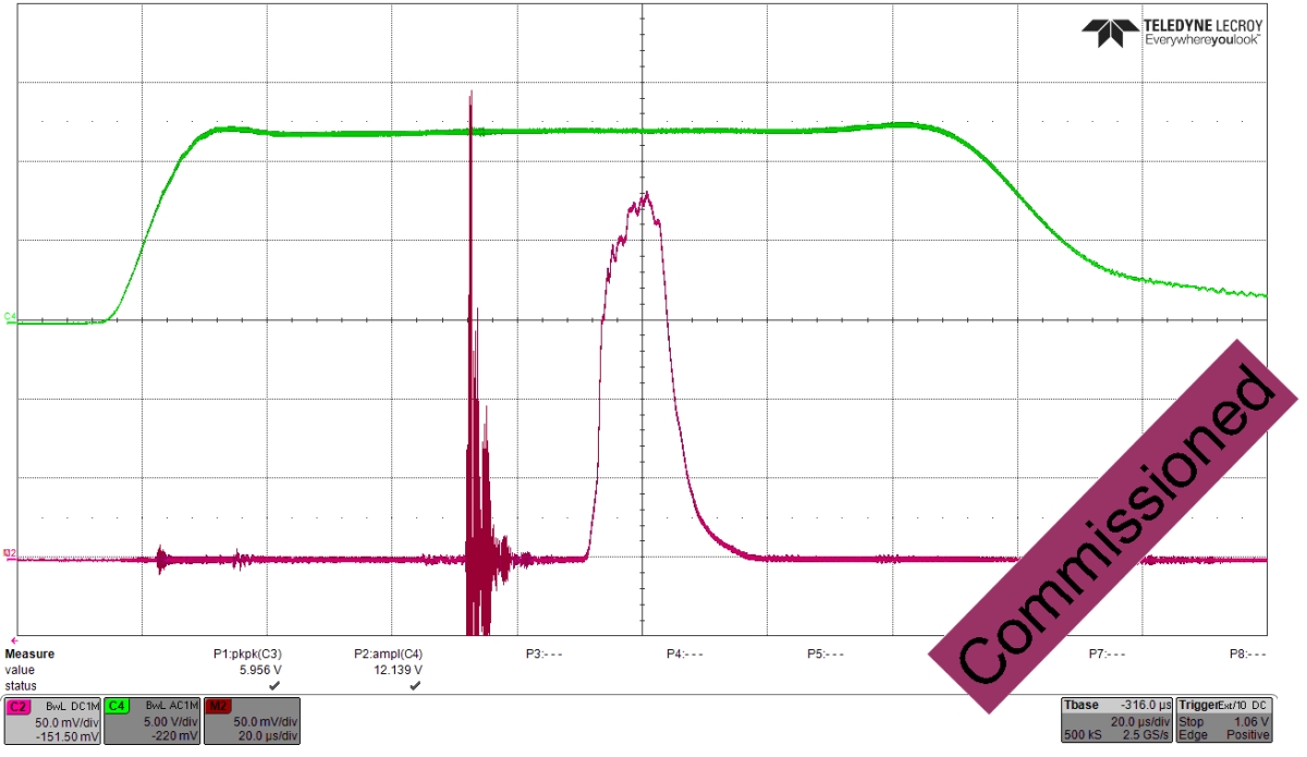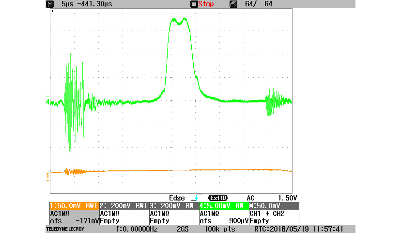 Acceleration of deuterons at LU-20 with RFQ. The green beam –output of LU-20, yellow – input. 100 Ω resistance in both cases. The signal output from LU-20 with the suppression of secondary emission (FC), on the entrance – no (collector)