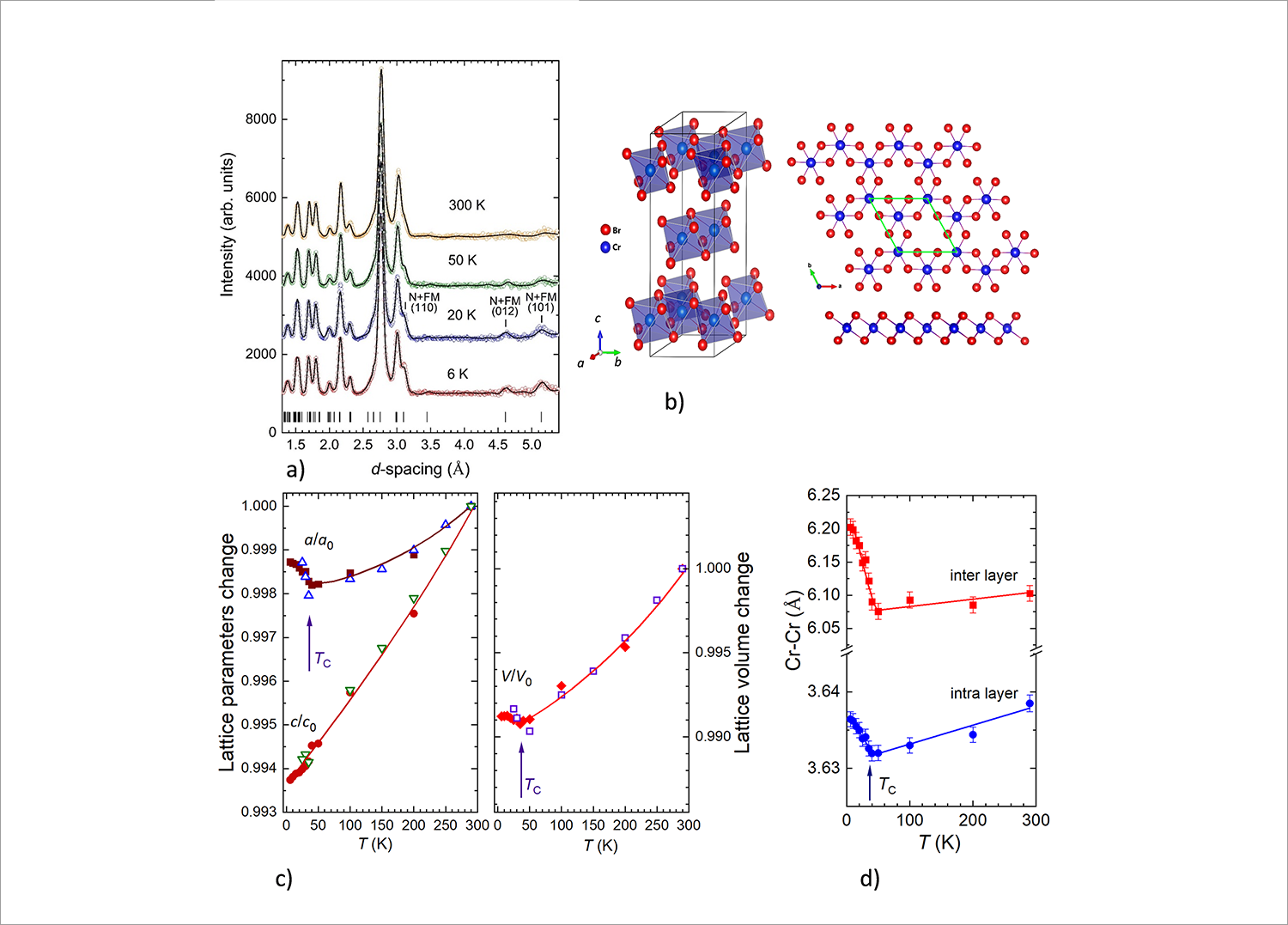The compounds CrBr3 и FePS3, which are representatives of a family of low-dimensional van der Waals layered magnetic materials with graphene-like magnetic lattice symmetry, demonstrate the existence of magnetic ordering down to the monolayer limit at sufficiently high temperatures. A rich variety of new physical phenomena have been discovered in these materials under variation of thermodynamic parameters (temperature and pressure), including the insulator-metal transition, spin crossover, and superconductivity. The studies of the structural and magnetic properties of the CrBr3 compound were performed at one of the JINR base facilities – the IBR–2 pulsed reactor, using the neutron diffraction method [1], and revealed the unusual effects. There is anomalous behavior of structural parameters in the temperature range of ferromagnetic ordering (ТС = 35 K), and a negative thermal expansion of the unit cell volume and quasi two-dimensional van der Waals layers in the temperature range T < TC (Fig. 1). It should be noted that negative thermal expansion is a relatively rare physical effect found only in a few classes of materials. The coefficient of linear thermal expansion of atomic layers in CrBr3 in the region T < Tc, αl = -1.6х10-5 K-1, is close to the corresponding value for graphene at low temperatures, which indicates a good compatibility of materials such as CrX3 and graphene in terms of prospects for development of heterostructures based on them. Its practical use can become an important step towards the development of an advanced generation of spintronics, nanoelectronics, recording and information storage devices.