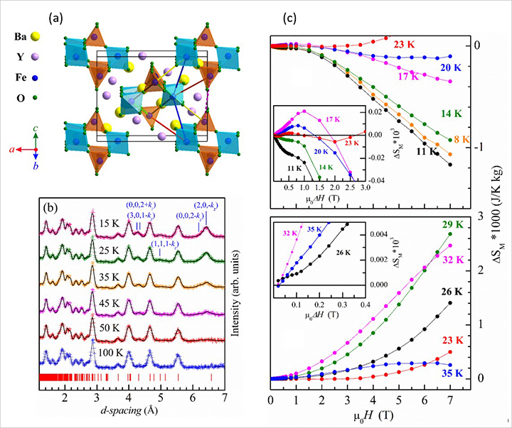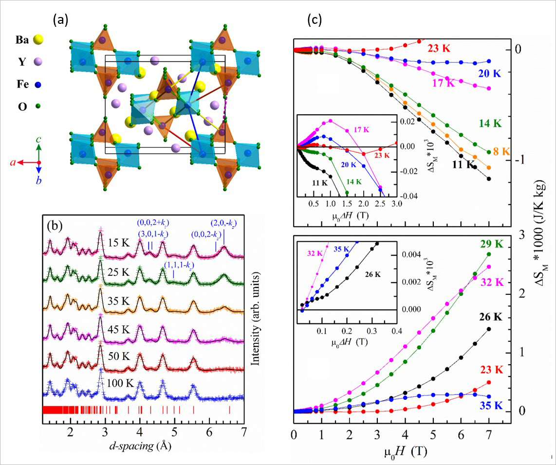 Fig. 2. a) The view of orthorhombic crystal structure of BaYFeO4 with Pnma symmetry. b) The neutron diffraction patterns of BaYFeO4 measured at various temperatures, and corresponding profiles calculated by the Rietveld method. c) The dependence of the change in the magnetic entropy on the magnitude of the external magnetic field at different temperatures