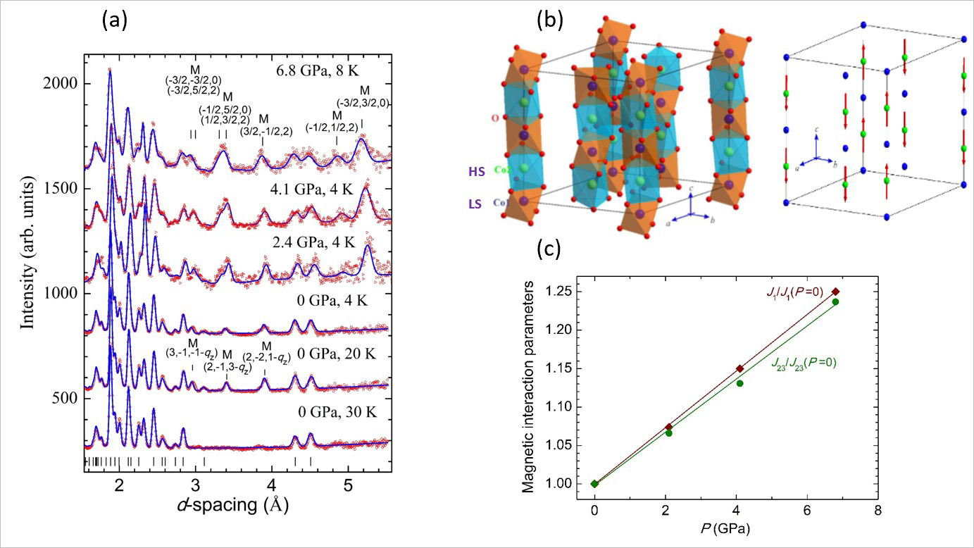 Fig. 3. a) Neutron diffraction patterns of Ca3Co2O6 obtained at various temperatures and pressures, and calculated profiles obtained using the Rietveld method. b) The representation of rhombohedral crystal structure of Ca3Co2O6 with R3 ̅c symmetry, and the magnetic structure of the new high-pressure phase. c) Relative variation of intra-chain (J1) and inter-chain (J23) magnetic interactions as a function of pressure.