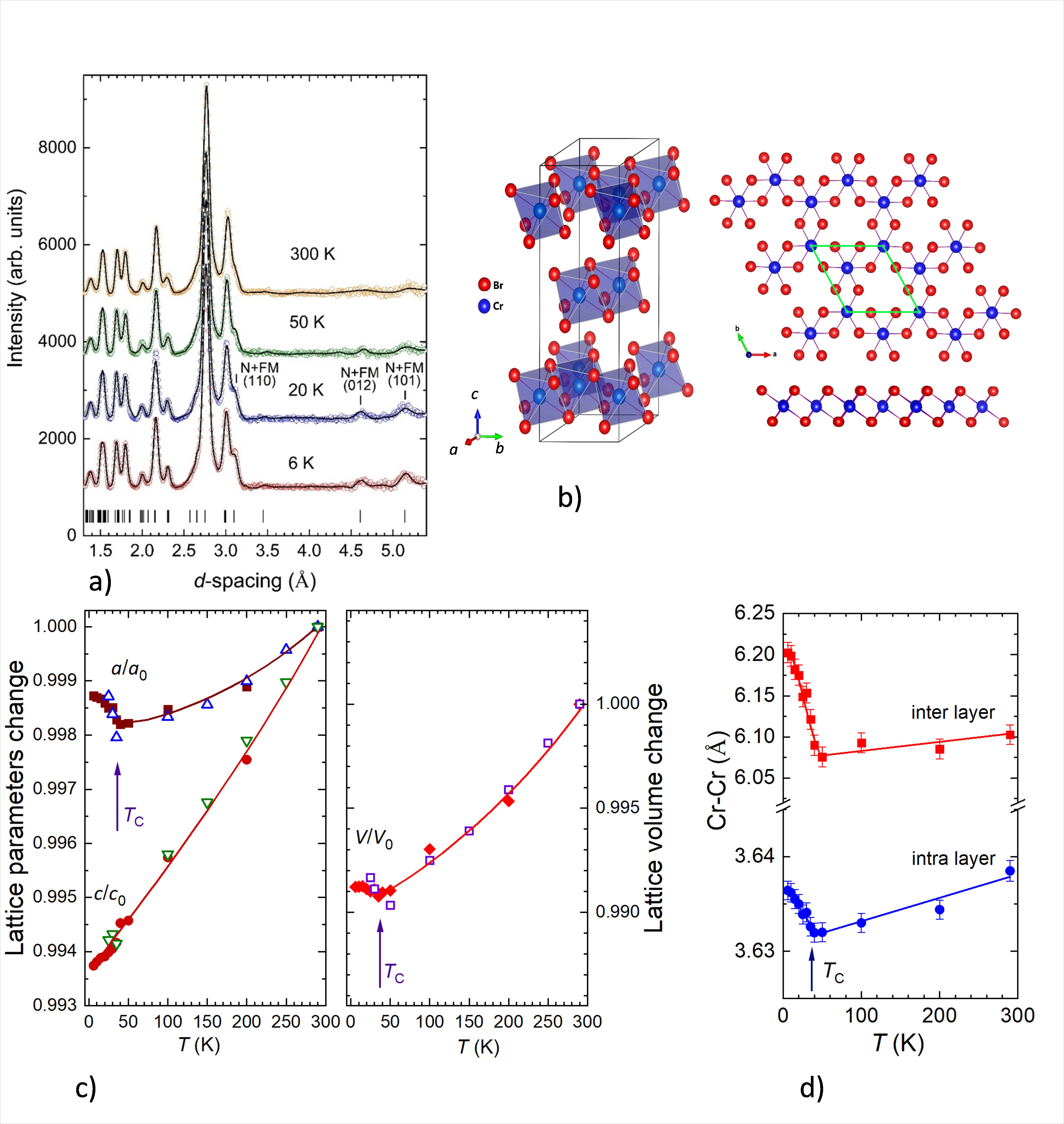 Fig. 1. a) Neutron diffraction patterns of CrBr3 measured at different temperatures and calculated profiles obtained by the Rietveld method. b) The schematic view of rhombohedral crystal structure of CrBr3 with symmetry R¯3. On the right van der Waals atomic layers are shown, top and side view. c) Temperature dependences of the lattice parameters and the unit cell volume of CrBr3, normalised to the corresponding values at room temperature. d) The temperature dependences of distances between Cr magnetic ions inside van der Waals layers (intra-layer) and between layers (inter-layer)
