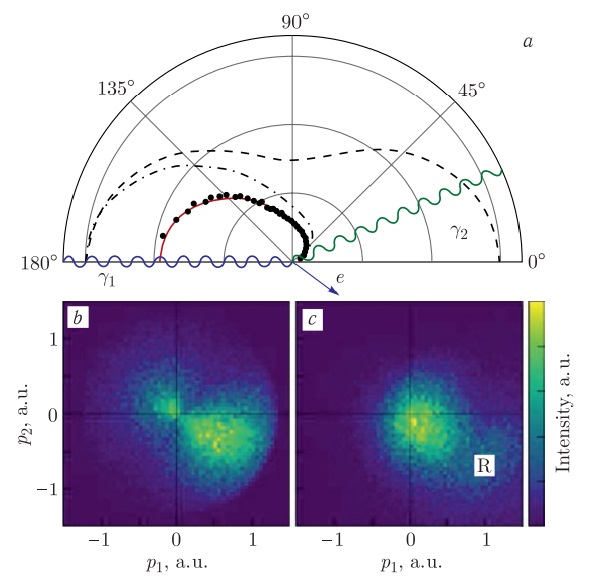 Fig. 2. Scheme of ionization by the Compton scattering at ω = 2.1 keV. a) The wavy lines indicate the incoming and scattered photons, and the arrow depicts the momentum vector of the emitted electron. The dashed line shows the Thomson cross section, i.e., the angular distribution of a photon scattering at a free electron. The black dots show the experimental photon angular distribution for ionization of He by the Compton scattering, integrated over all electron emission angles and energies below 25 eV. The statistical error is smaller than the dot size. The black dash-dotted line shows the A2 approximation for all electron energies, and the solid red line shows the A2 approximation for electron energies below 25 eV. The black dashed and dash-dotted lines are multiplied by a factor of 1.9. b) Momentum distribution of electrons emitted by the Compton scattering of 2.1 keV photons at He. The coordinate frame is the same as in a, i.e., the plane is defined by the incoming (horizontal) and scattered photon (upper half plane). The momentum transfer points to the forward lower half plane. The data are integrated over the out-of-plane electron momentum components. c) He+ ion momentum distribution for the same conditions as in b