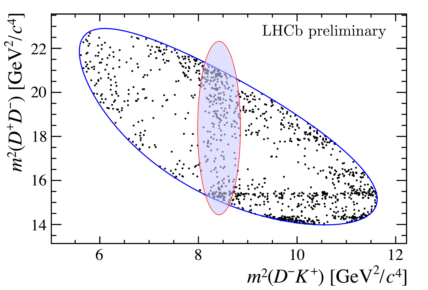 The well-established quark model predicts that some of the D+D pairs in this transformation could be the result of intermediate particles – such as the ψ(3770) meson – that only manifest momentarily: B+→ψ(3770)K+→D+DK+. However, theory does not predict meson-like intermediaries resulting in a DK+ pair. LHCb were therefore surprised to see a clear band in their data corresponding to an intermediate state transforming into a DK+ pair at a mass of around 2.9 GeV/c², or around three times the mass of a proton.