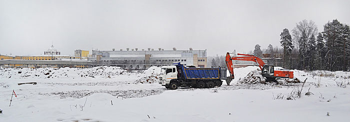 Сейчас на строительстве работы ведутся «точечно» — в одном углу экскаватор вынимает грунт, на другой стороне чернеет на фоне снега свежевыкопанная траншея, мелькают фирменные строительные каски и униформа работников «Штрабаг». Через месяц-другой эта территория заполнится техникой, строителями — как только будет готова поверхность, прибудут сваевдавливающие установки, за ними начнется разработка котлована, потом эстафета перейдет к бетонщикам и так далее, до тех пор, пока на месте снежной равнины не вырастут корпуса для детекторов и ускорителей.