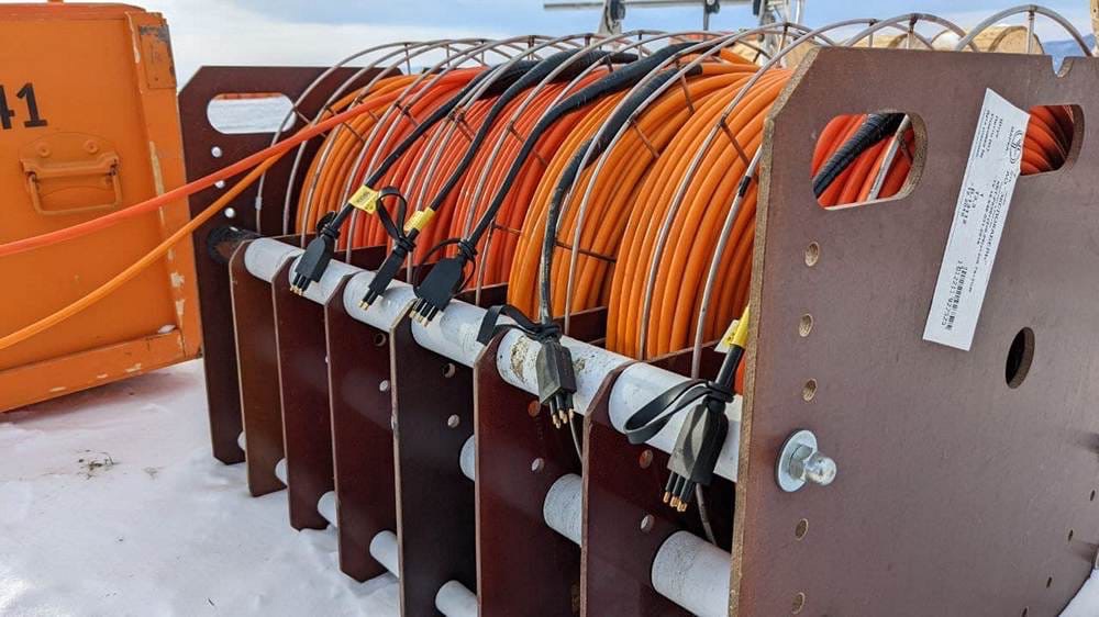 Окончены подготовительные работы по прокладке донного кабеля для десятого кластера. Проложены его первые 700 м. Кабели играют ключевую роль, так как по ним подается напряжение, и именно с их помощью снимается сигнал. Каждая гирлянда включает в себя около четырех с половиной километров кабеля. То есть весь телескоп, который к окончанию экспедиции будет состоять из десяти кластеров (по восемь гирлянд каждый), будет иметь около 360 километров кабеля, без учета тех линий, которые идут на берег.