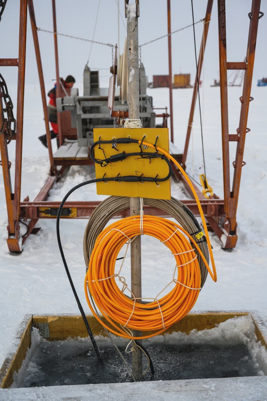 Еще одна важная деталь конструкции нейтринного телескопа — это якорь, первая, самая нижняя точка каждой гирлянды оптических модулей, с которой начинается сборка. Якорь наполняют грузом (рельсами), взвешивают, после чего отправляют под лед. Вес якоря 1060 кг. Это минимально необходимый вес, чтобы удержать гирлянду.