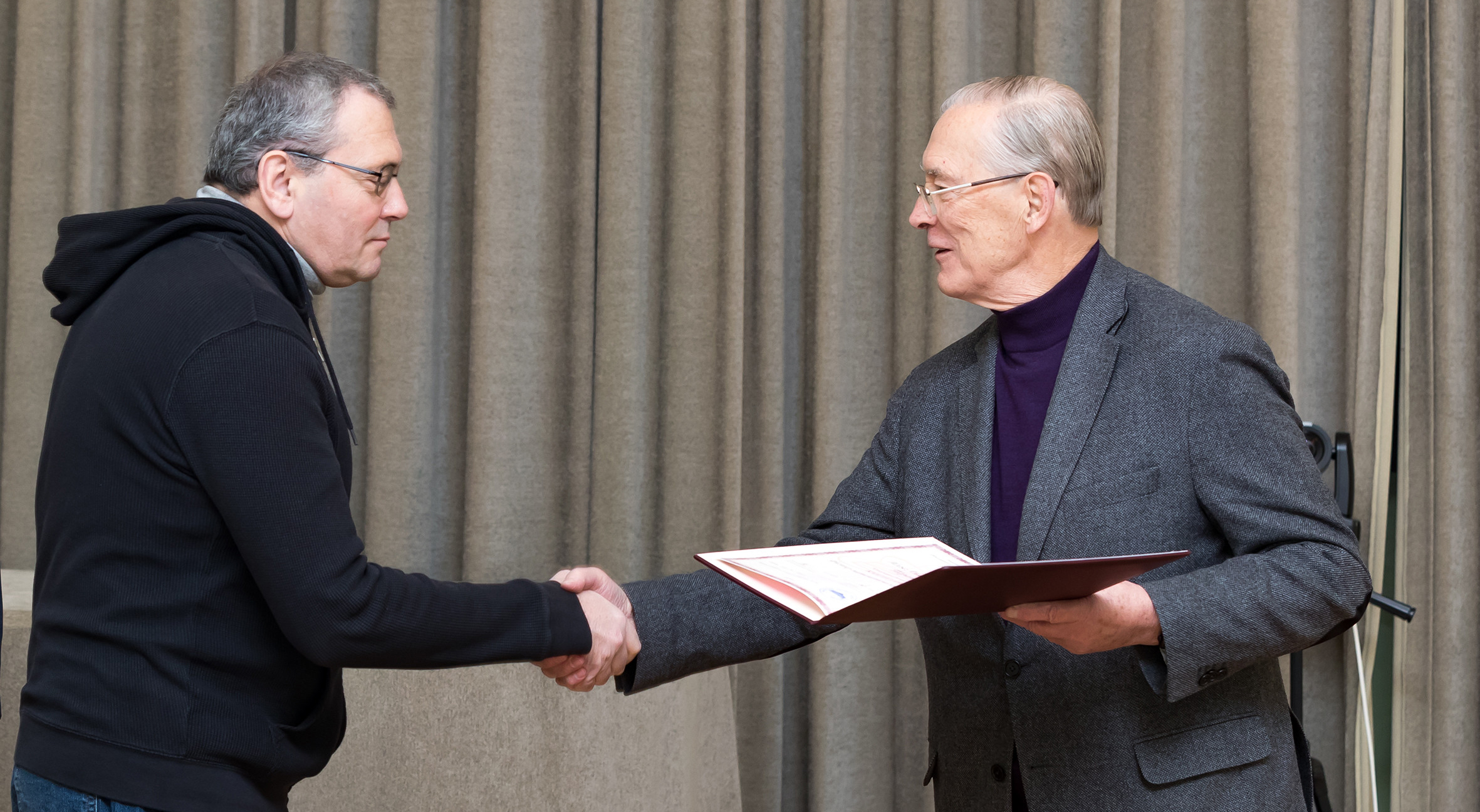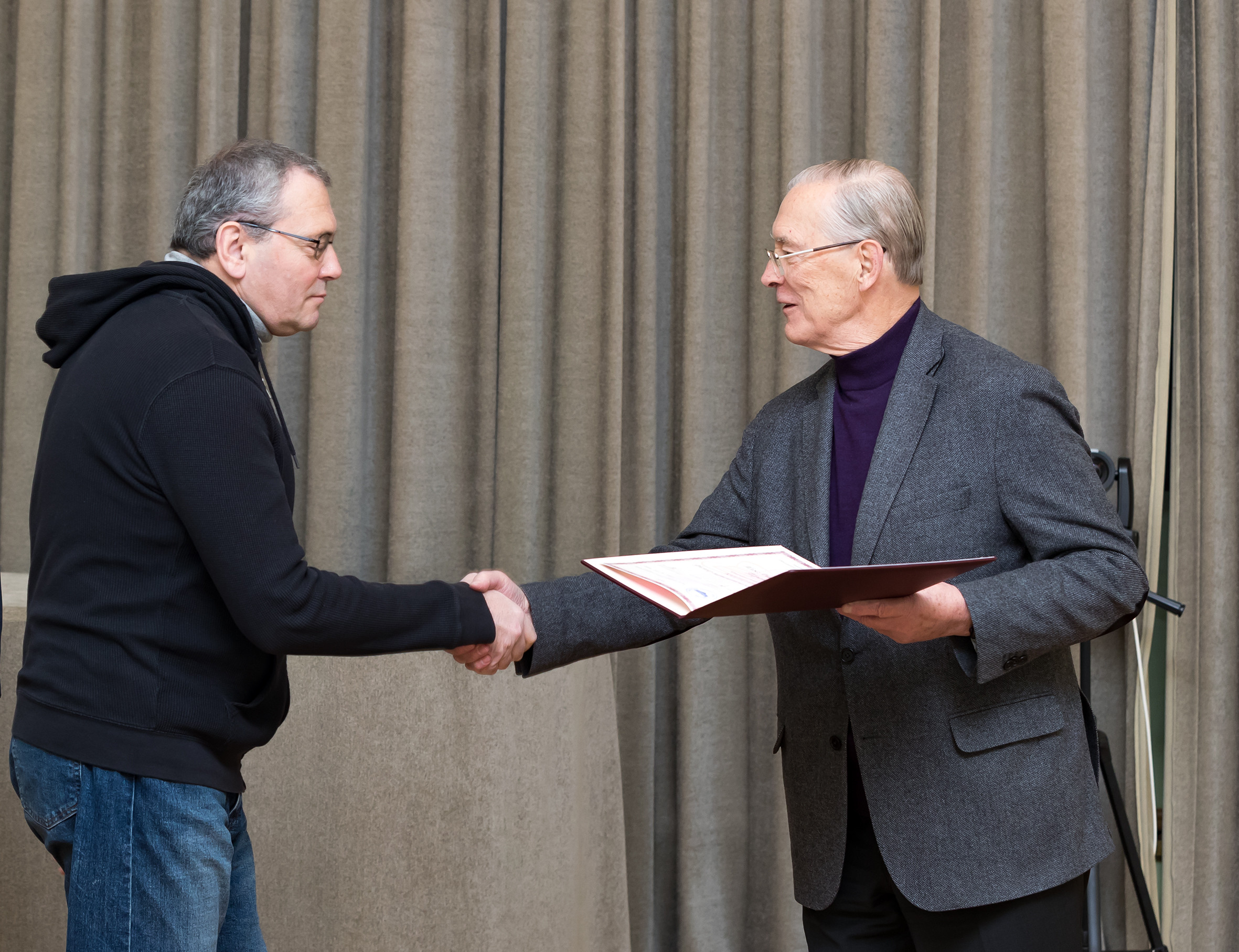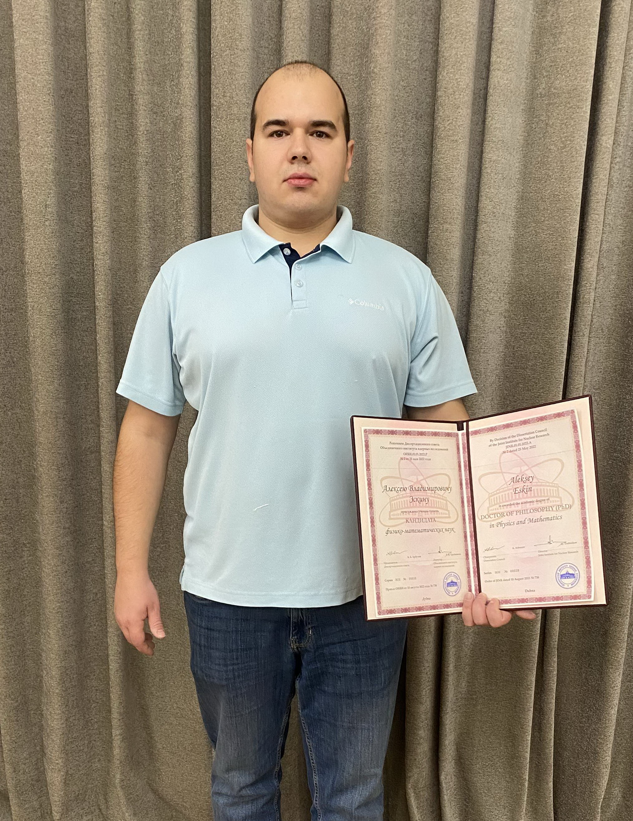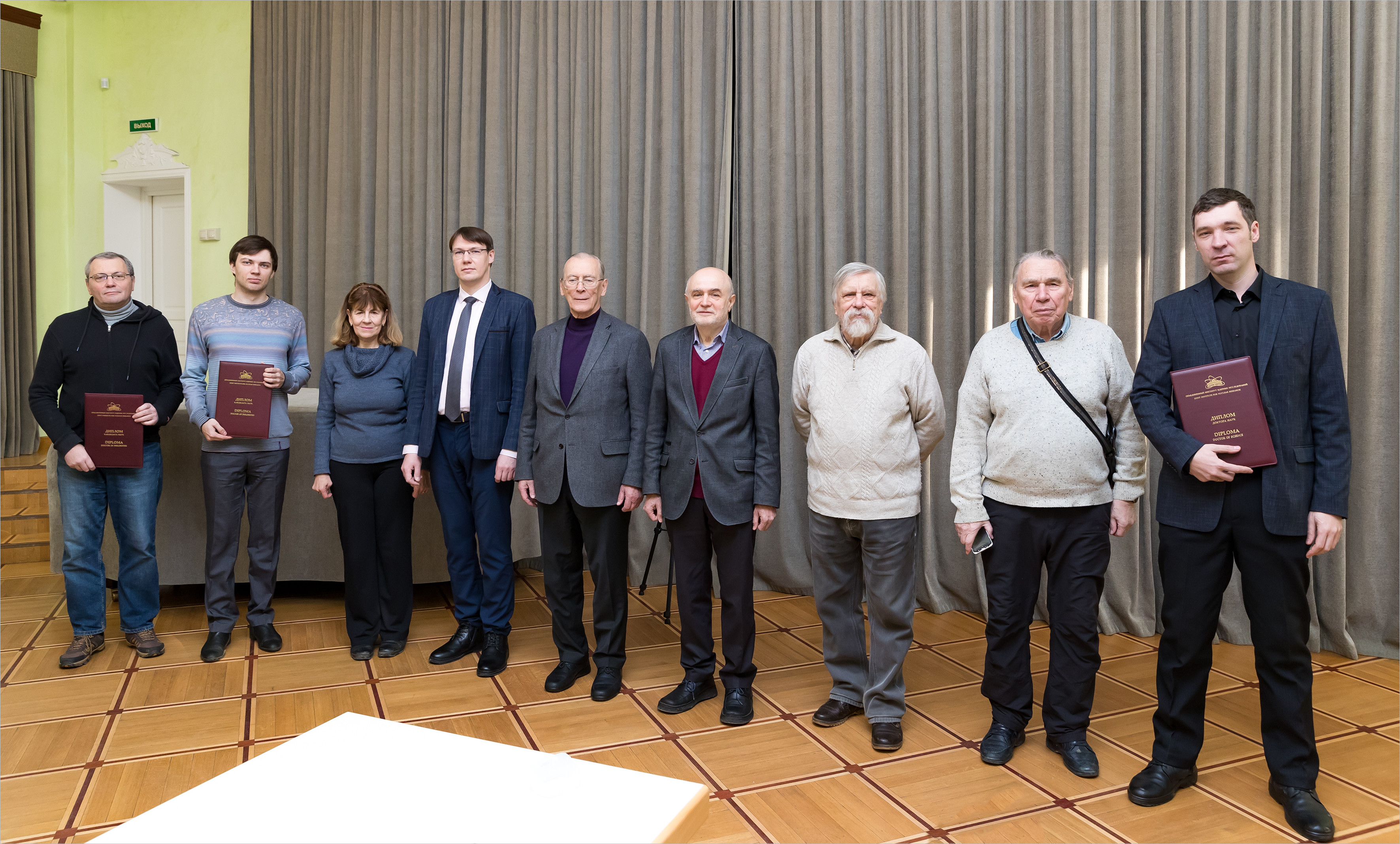 На торжественной церемонии дипломы получили Виктор Смирнов, Евгений Степанов и научный руководитель Ильи Перапечки — Яков Шнир по доверенности от соискателя. В тот же день диплом о присуждении ученой степени был вручен Алексею Эскину, не имевшему возможности присутствовать на торжественной части. Несколькими днями ранее диплом ОИЯИ был передан для вручения диссертанту из Египта Махмуду Абдельлатифу.