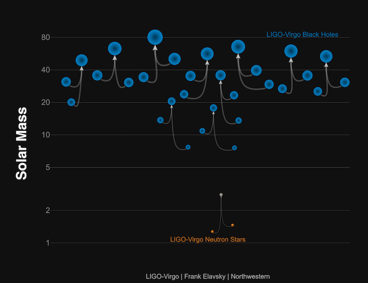Схема всех астрономических событий, гравитационные волны от которых были зафиксированы коллаборациями LIGO и Virgo // Источник: LIGO DCC