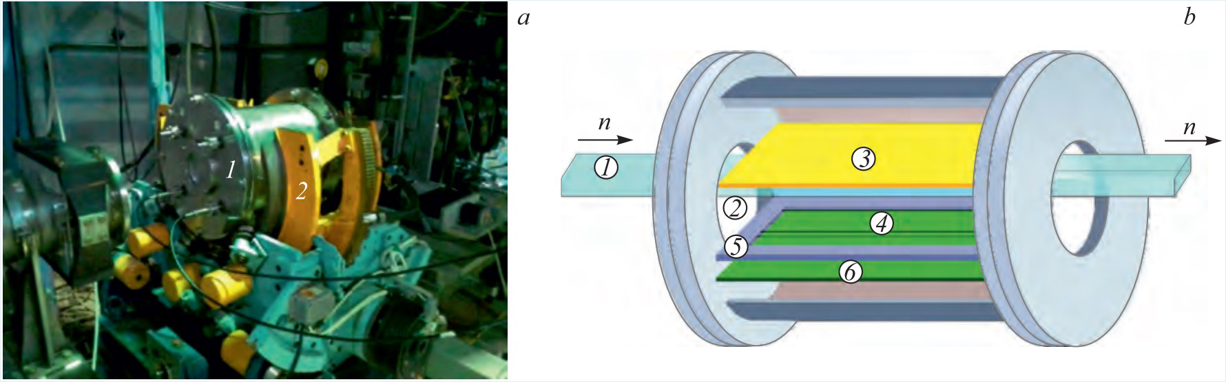 Рис. 1 а) Ионизационная камера (1), установленная в гониометре (2) спектрометра РЕМУР; b) схема ионизационной камеры: 1 — пучок нейтронов; 2 — входное и выходное окна; 3 — катод; 4 — сетка; 5 — рамка сетки; 6 — коллектор (анод)