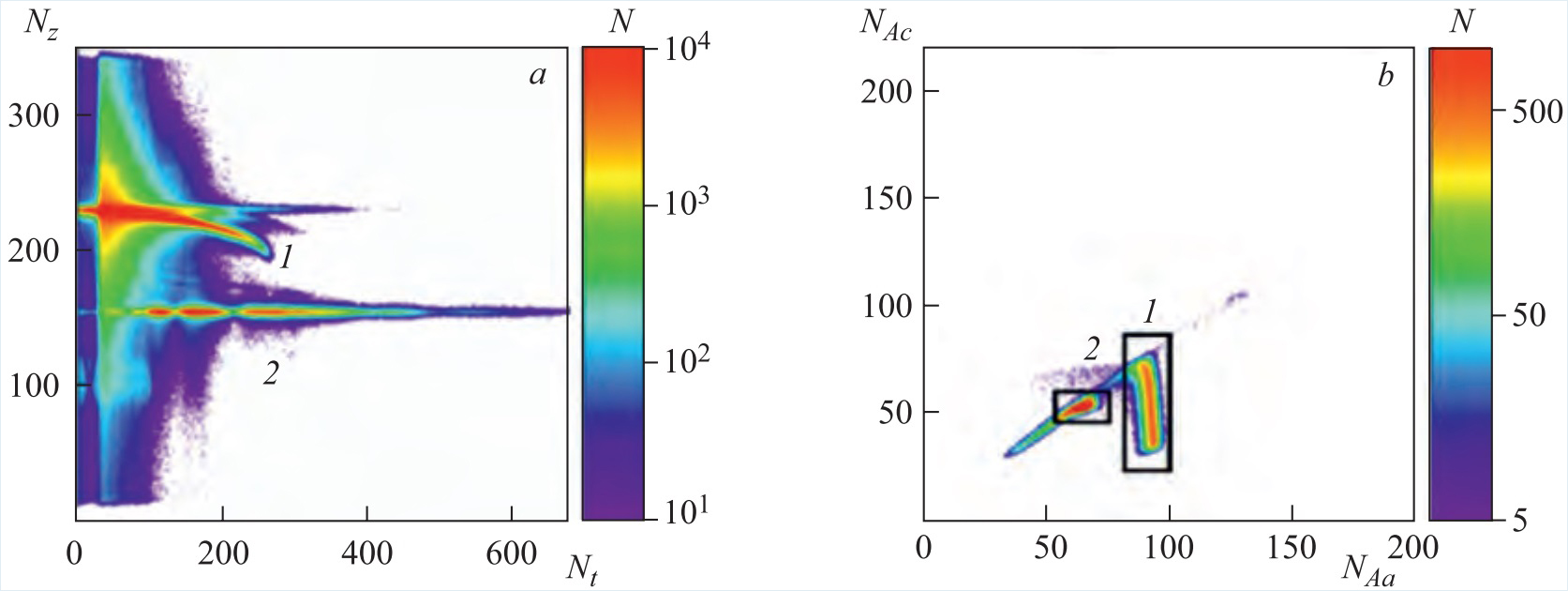 Рис. 2 а) Картина распределения интенсивности нейтронов на детекторе в плоскости NzNt: 1 — преломленный пучок; 2 — отраженный пучок; b) карта распределения интенсивности счета тритонов (1) и альфа-частиц (2) в ионизационной камере в зависимости от амплитуд сигналов (номера канала) с анода (NAa) и катода (NAc)