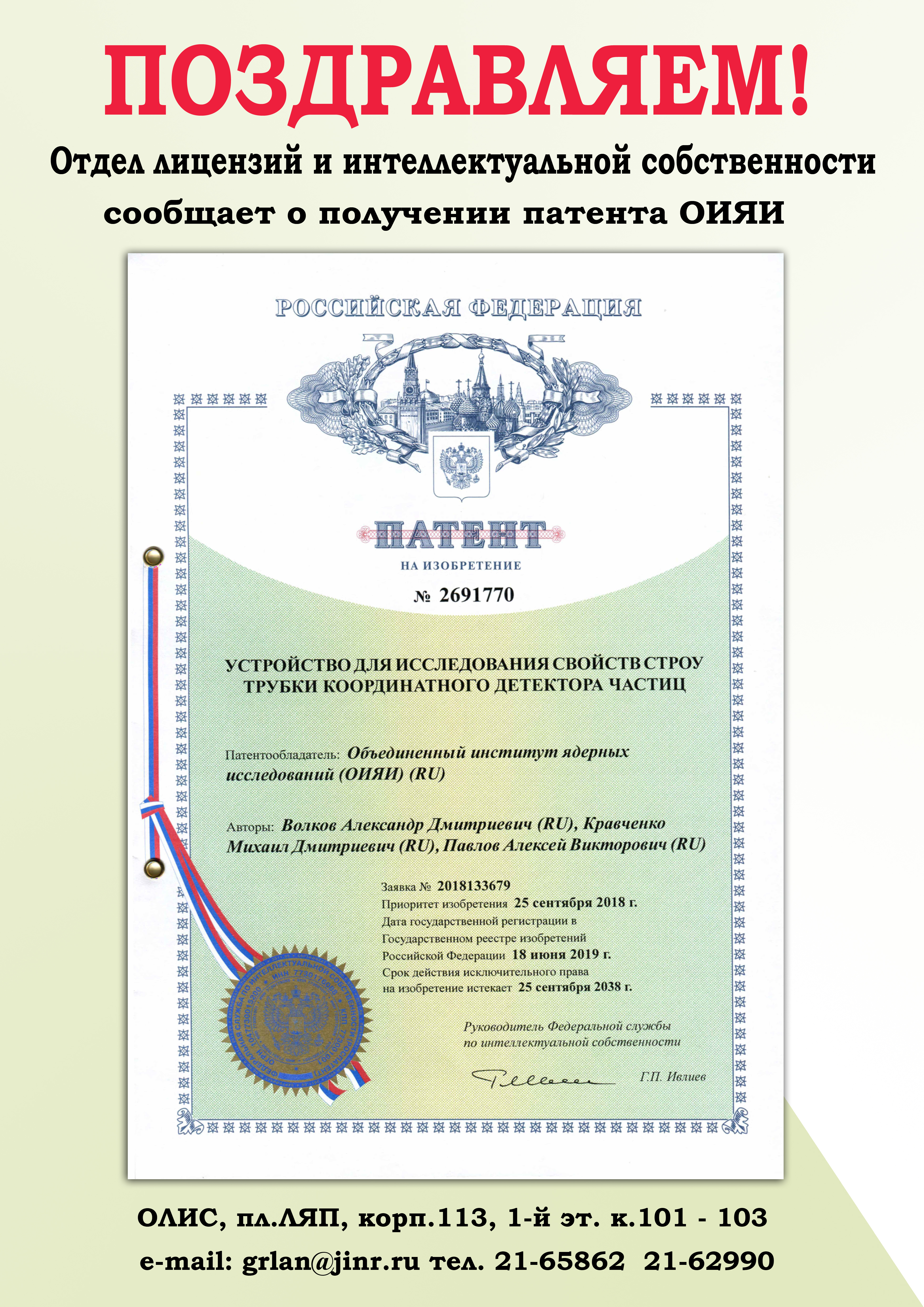 До публикации статьи о своей научно-технической разработке сотрудники ОИЯИ могут обратиться в Отдел лицензий и интеллектуальной собственности для оформления заявки на патент.