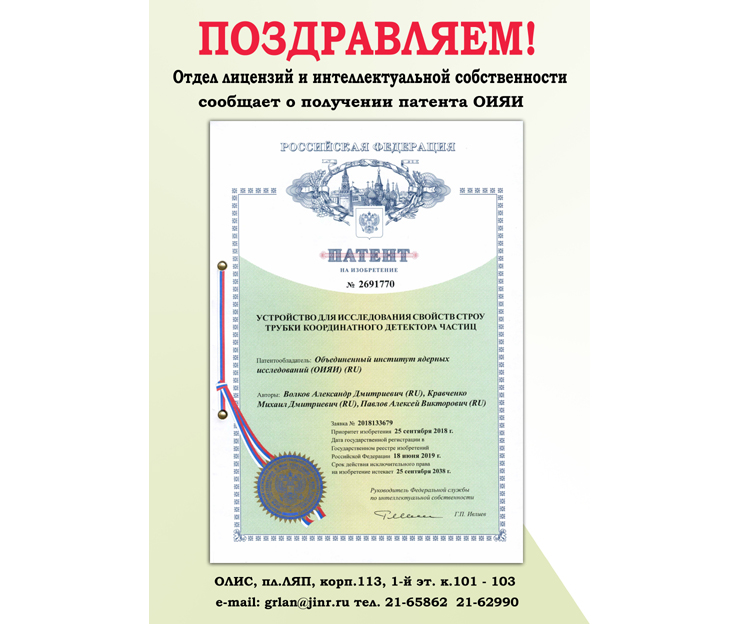 Отдел лицензий и интеллектуальной собственности ОИЯИ сообщает, что 18 июня 2019 года Объединенным институтом ядерных исследований был получен патент на изобретение «Устройство для исследования свойств строу трубки координатного детектора частиц». Авторами работы являются Волков Александр Дмитриевич, Кравченко Михаил Дмитриевич, Павлов Алексей Викторович.