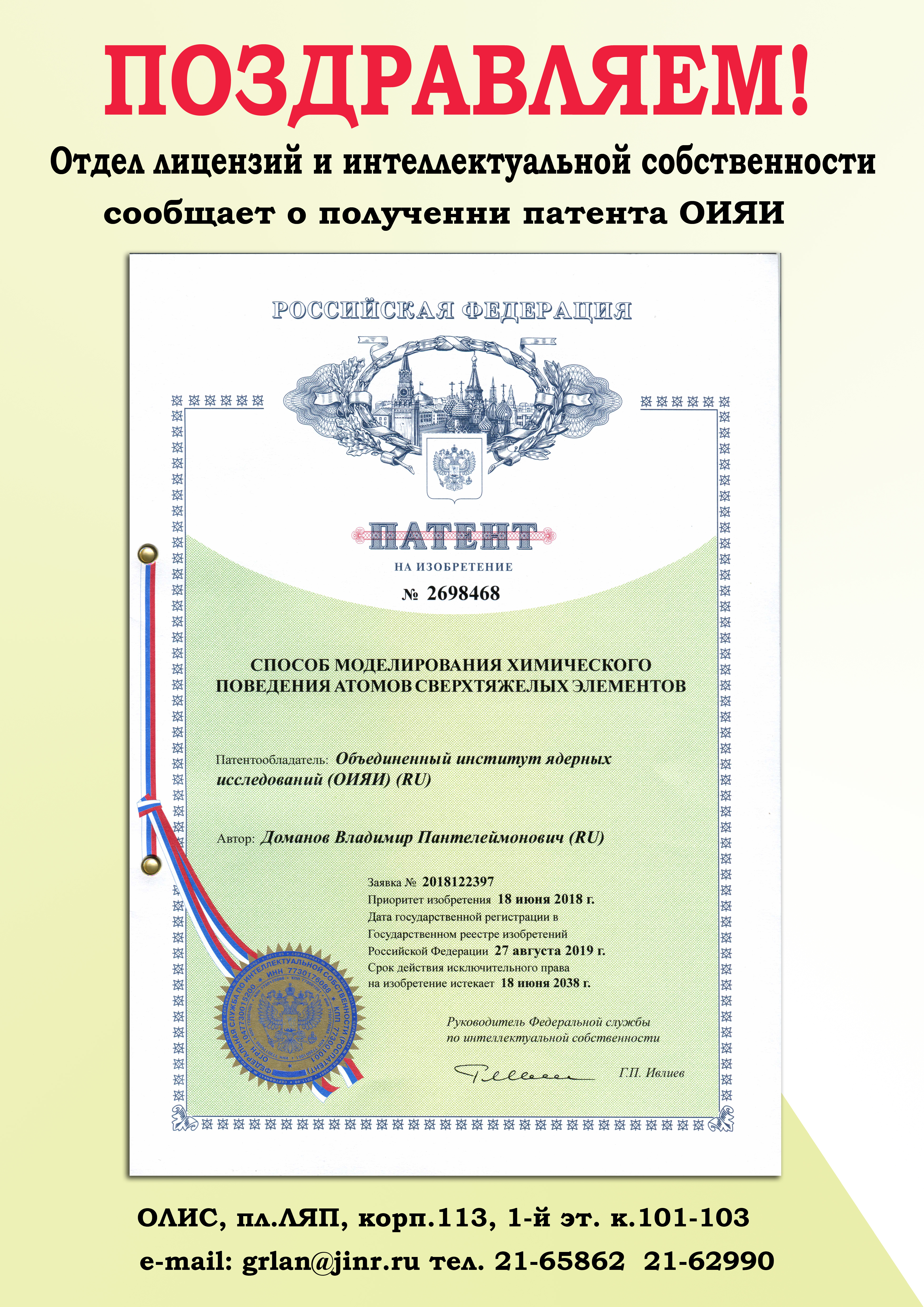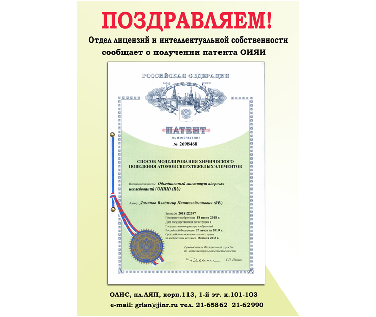 Отдел лицензий и интеллектуальной собственности ОИЯИ сообщает, что 27 августа 2019 года Объединенным институтом ядерных исследований был получен патент на изобретение «Способ моделирования химического поведения атомов сверхтяжелых элементов». Автором работы является Доманов Владимир Пантелеймонович.