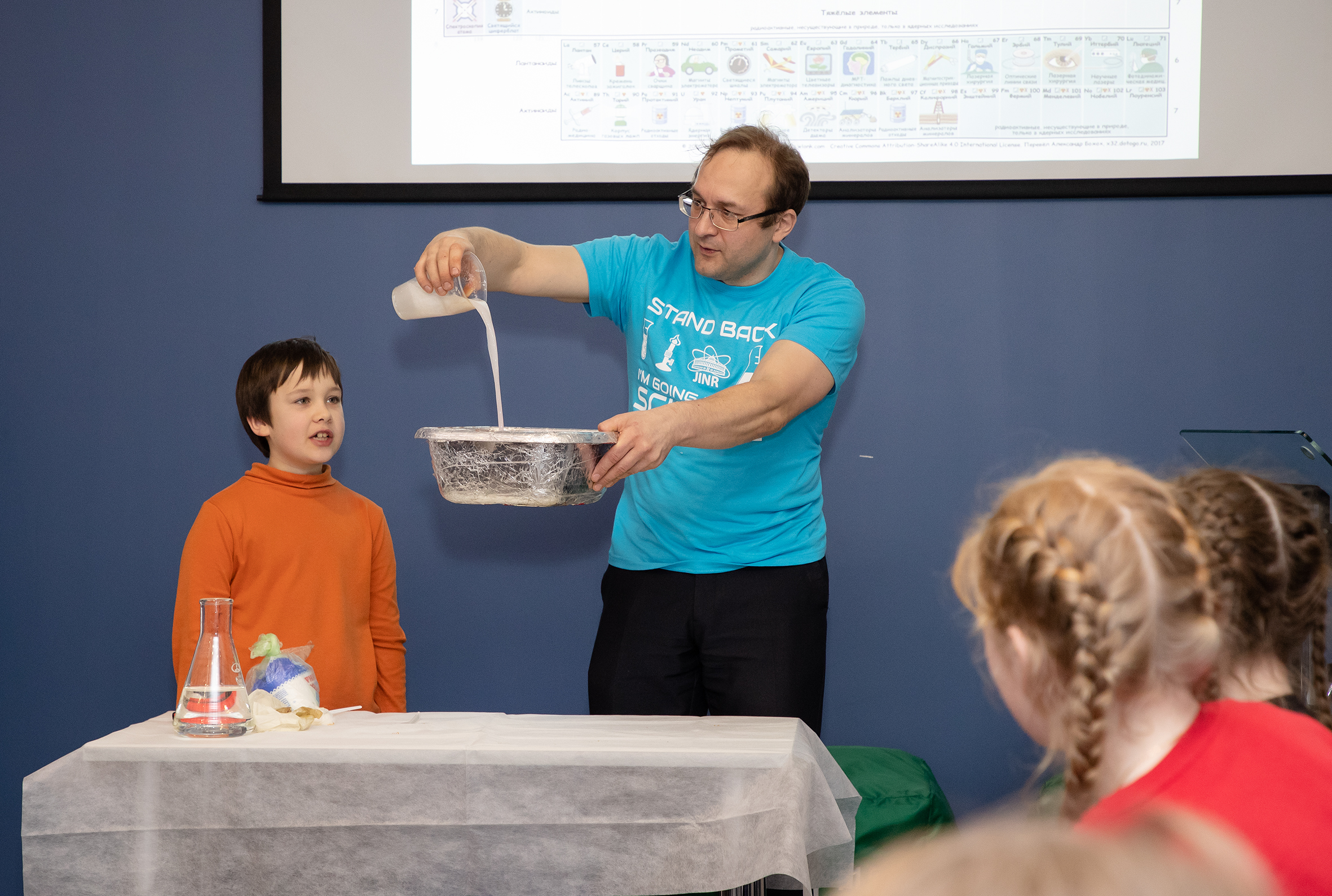 Надо понимать, что в ОИЯИ много сотрудников, которые имеют дело с жидким азотом в своей профессиональной деятельности. И тем более, были и есть сотрудники, которые проводят аналогичные опыты для школьников. Мне просто первому предложили участвовать в программе, и опыты с жидким азотом от ОИЯИ стали впоследствии ассоциироваться со мной, хотя это и не совсем правильно.