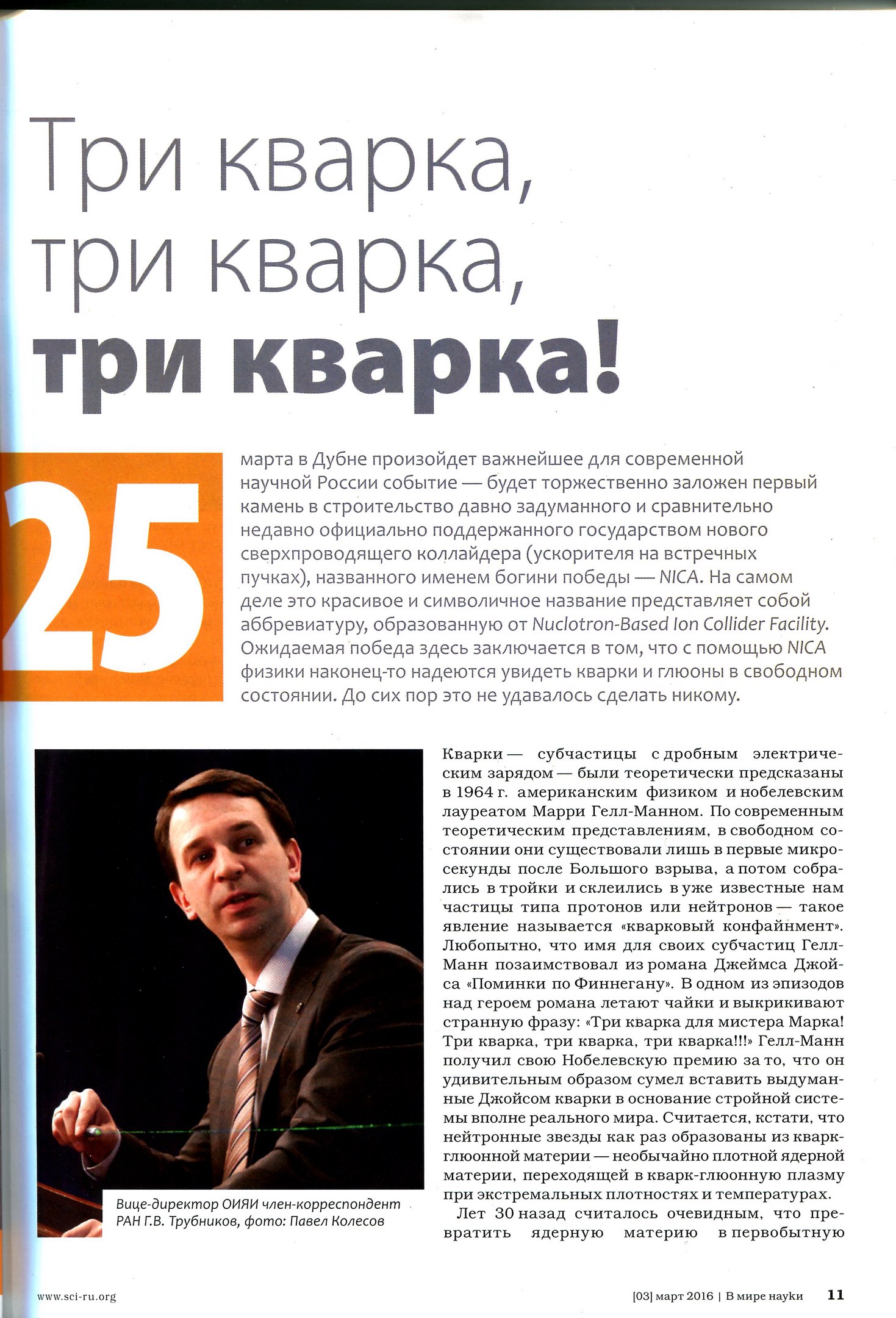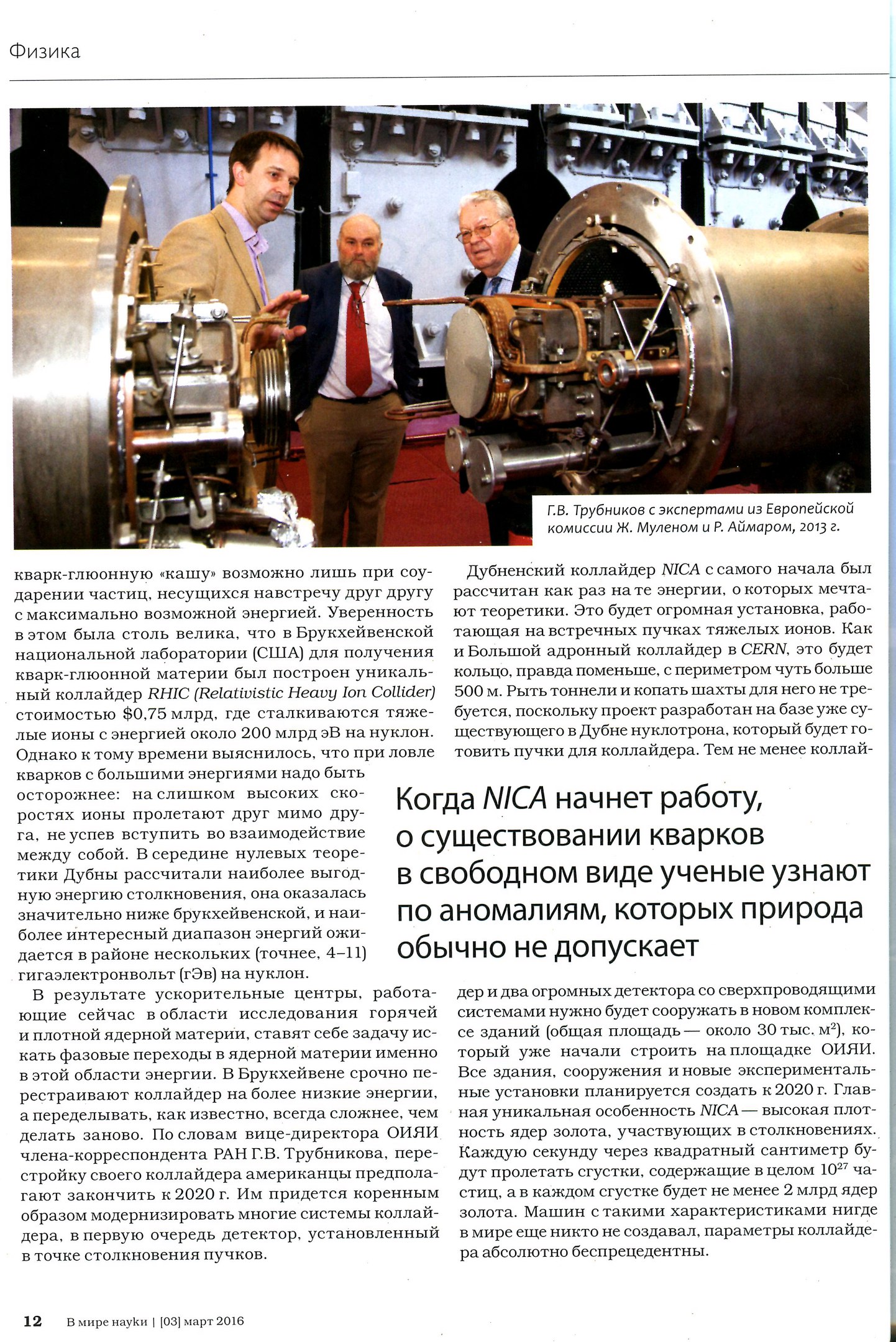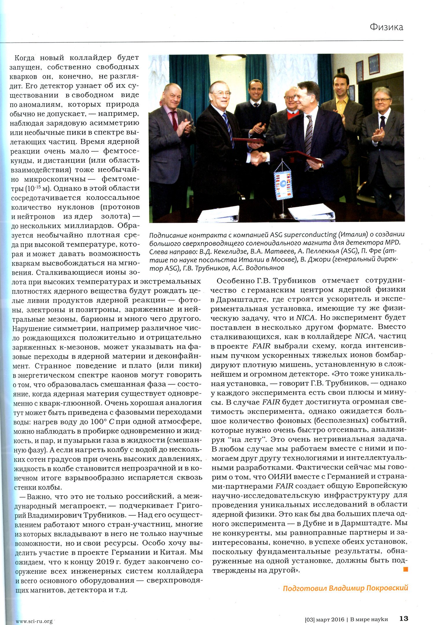 О проекте NICA вышла статья в мартовском номере журнала «В мире науки». Один из ведущих научных журналистов страны Владимир Покровский популярно рассказывает о физической задаче, для исследования которой предназначен ускорительный комплекс NICA, о том, как развивалось это направление в мире и что в итоге хотят получить физики. Вице-директор ОИЯИ член-корреспондент РАН В.Г.Трубников подчеркивает международный статус проекта, говорит об участии зарубежных партнеров.