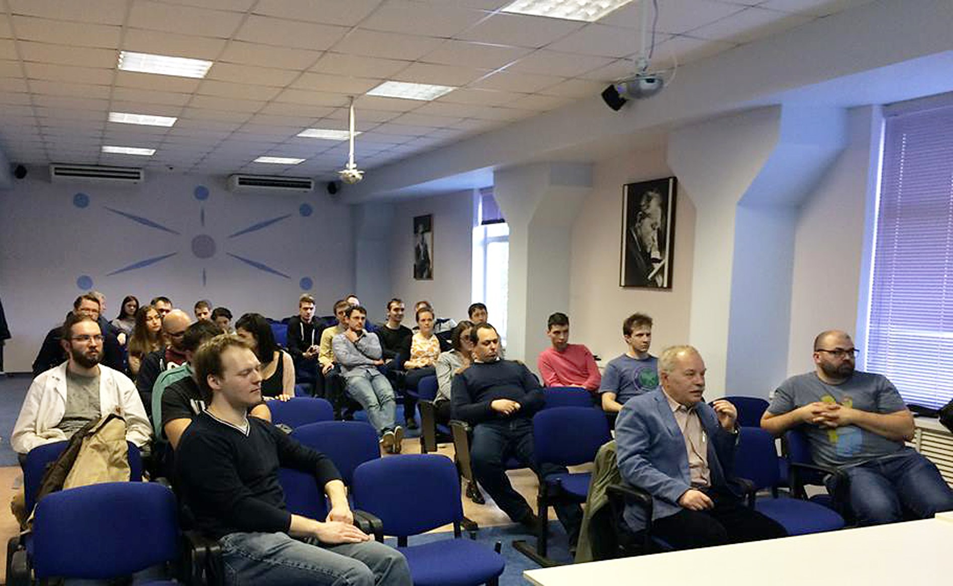 Встреча молодых ученых и специалистов впервые за последние годы прошла на площадке ЛФВЭ 20 апреля. Собрание посетили около 30 сотрудников, помощник директора ОИЯИ Г.Д. Ширков, ученый секретарь ЛФВЭ Д. В. Пешехонов, предыдущие председатели ОМУС В. Худоба и А.С. Айриян.