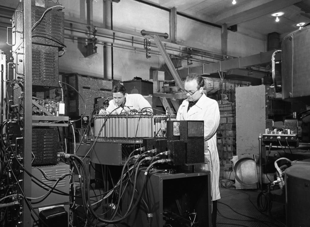 Директор Лаборатории ядерных реакций Георгий Флеров и Юрий Оганесян у циклотрона У-300