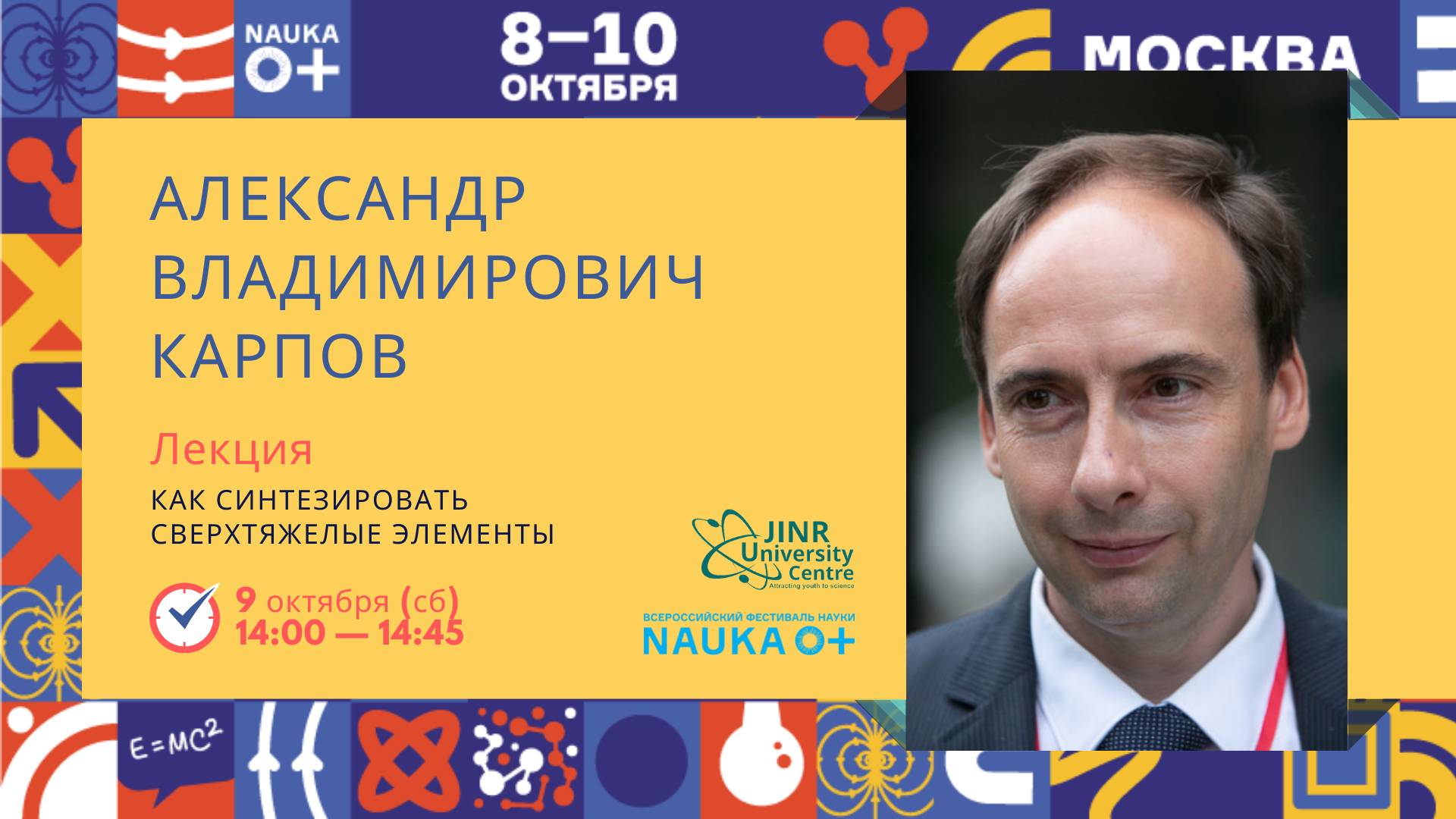 09 октября 2021 в 14:00 о том, «Как синтезировать сверхтяжелые элементы», расскажет доктор физико-математических наук Александр Карпов, ученый секретарь Лаборатории ядерных реакций им. Г. Н. Флерова.
