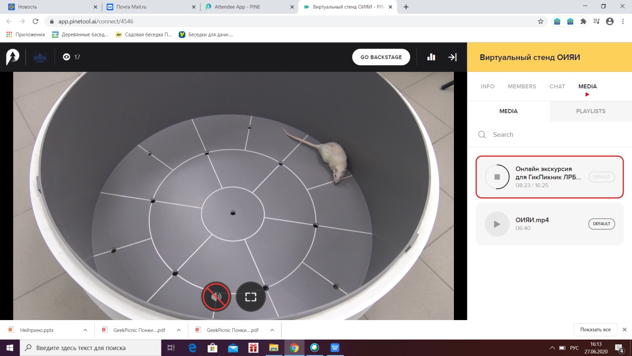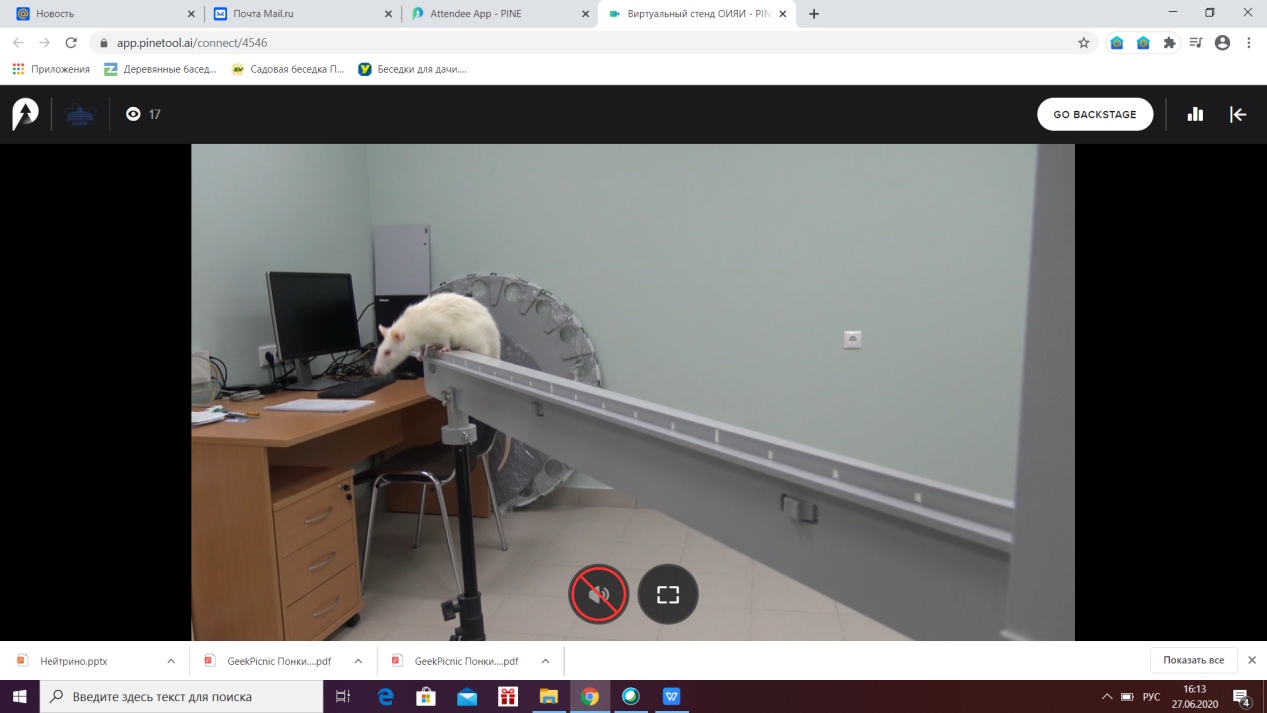 Видеоэкскурсию в Лабораторию радиационной биологии провел Ю. С. Северюхин, научный сотрудник сектора радиационной физиологии ЛРБ. Он показал, как проводятся поведенческие эксперименты на мелких лабораторных животных, как исследуют влияние космической радиации на мышей и крыс. А после экскурсии ответил на вопросы слушателей онлайн.