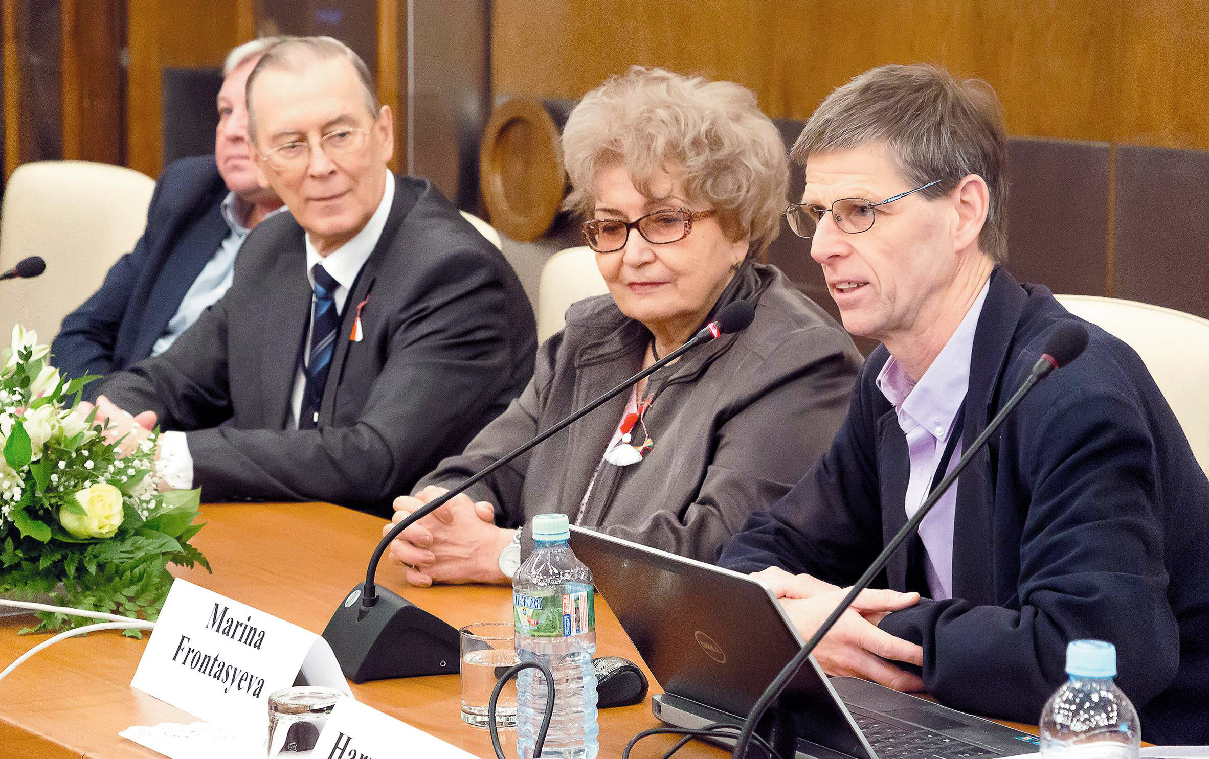 Совещание участников Программы ООН по воздуху Европы в Дубне в 2016 году. Справа налево: Председатель Комиссии ООН по воздуху Европы Х. Харменс, Координатор Программы М.В. Фронтасьева, Директор ОИЯИ В.А. Матвеев, Директор ЛНФ В.Н. Швецов