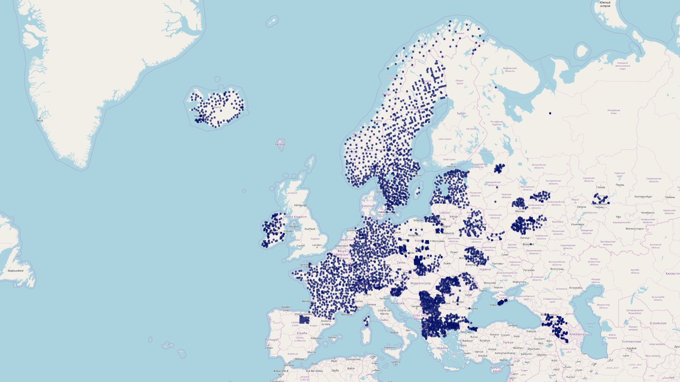 Так выглядит карта пробоотбора в Европе в 2015-2016 гг. В общей сложности в базу данных была занесена информация по 5156 образцам мхов-биомониторов, которые служат аналогами воздушных фильтров и содержат данные о загрязнении окружающей среды тяжелыми металлами и другими токсичными элементами.