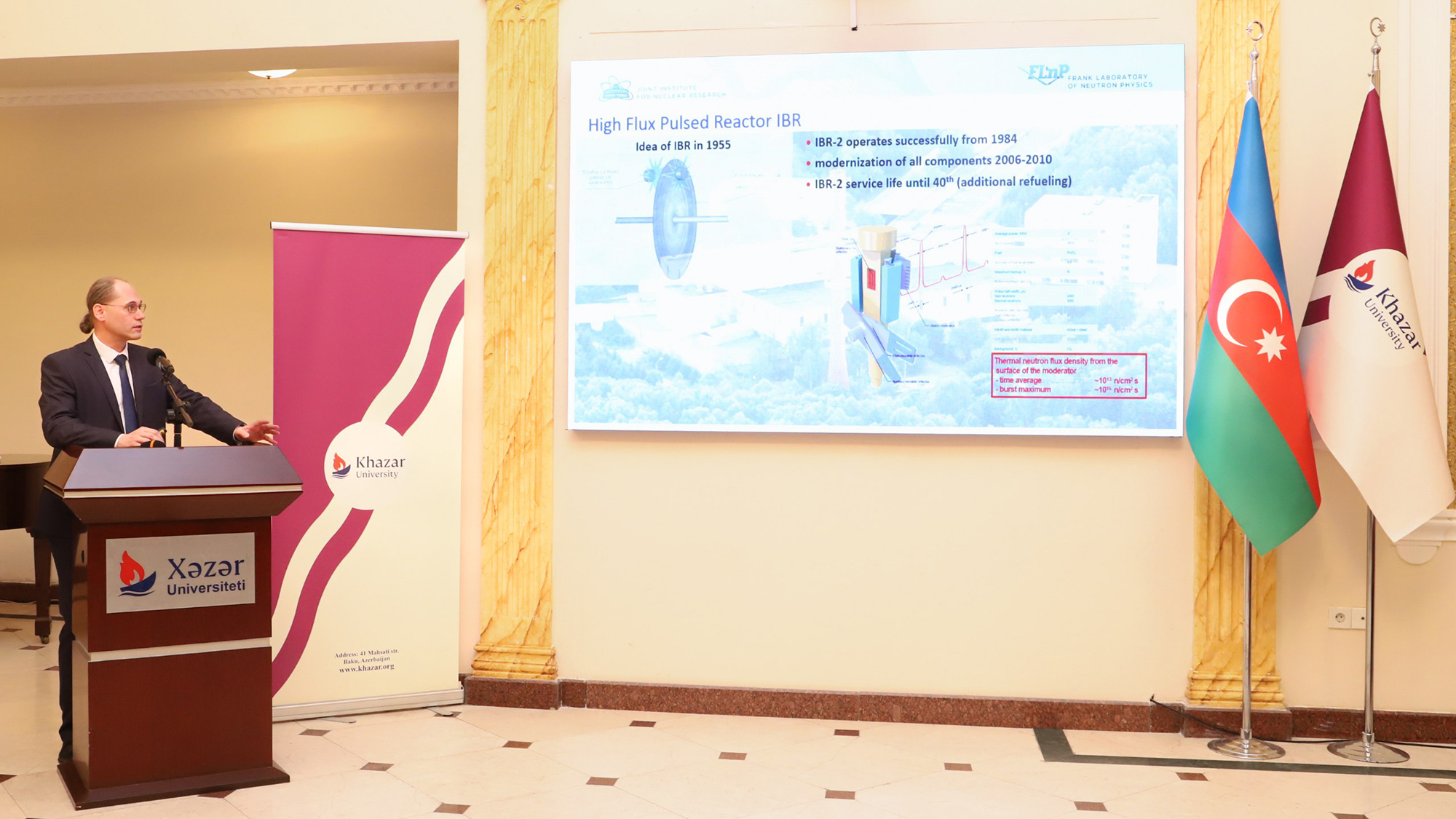 Кроме того, в эти дни был организован семинар для студентов и сотрудников университета, на котором Григорий Трубников представил общую информацию о научно-исследовательской деятельности Института, а сотрудники ЛРБ, ЛНФ и ЛЯП выступили с докладами на тему исследований в области наук о жизни. Завершилось мероприятие обсуждением перспектив совместной деятельности в этой области. В дискуссии принимали участие ректор Университета Хазар Ирада Халилова, руководитель Исследовательского центра инженерии биоматериалов (EBMRC) Судабе Даваран, декан факультета наук о жизни Джамала Эльдарова, декан факультета физики и электроники Фарида Татардар, декан школы наук и инженерии Фахранда Афанди. Со стороны ОИЯИ выступали директор ЛРБ Александр Бугай, заместитель директора ЛНФ Норберт Кучерка, заместитель начальника отделения ЛФВЭ Олег Белов, старший научный сотрудник ЛНФ Татьяна Муругова, начальник сектора ЛРБ Юрий Северюхин, младший научный сотрудник ЛЯП Михаил Зарубин и руководитель азербайджанского землячества в ОИЯИ, старший научный сотрудник ЛЯП Назим Гусейнов. По итогам обсуждений стороны договорились о проведении совместных междисциплинарных исследований в области многокомпонентной лучевой терапии онкологических заболеваний.