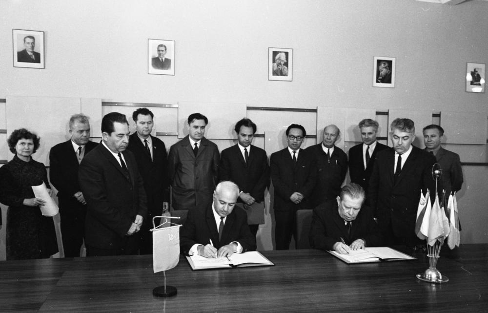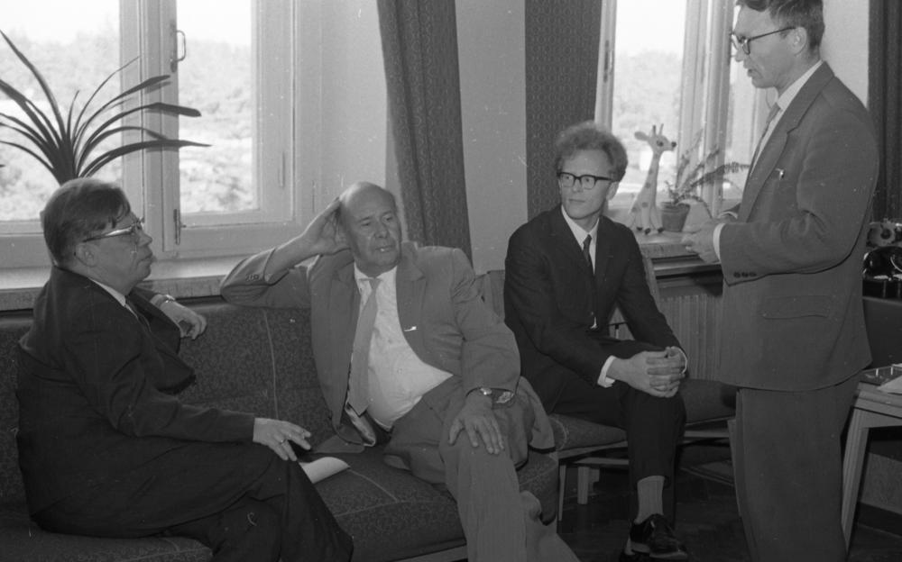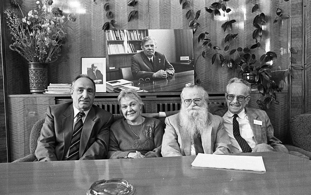 В мемориальном кабинете академика Н. Н. Боголюбова в ЛТФ. Слева направо: президент Академии наук Грузии А. Н. Тавхелидзе, сотрудник ЛТФ ОИЯИ Н. С. Исаева, директор ИФВЭ академик А. А. Логунов, директор ЛТФ ОИЯИ академик Д. В. Ширков, 1994 г.