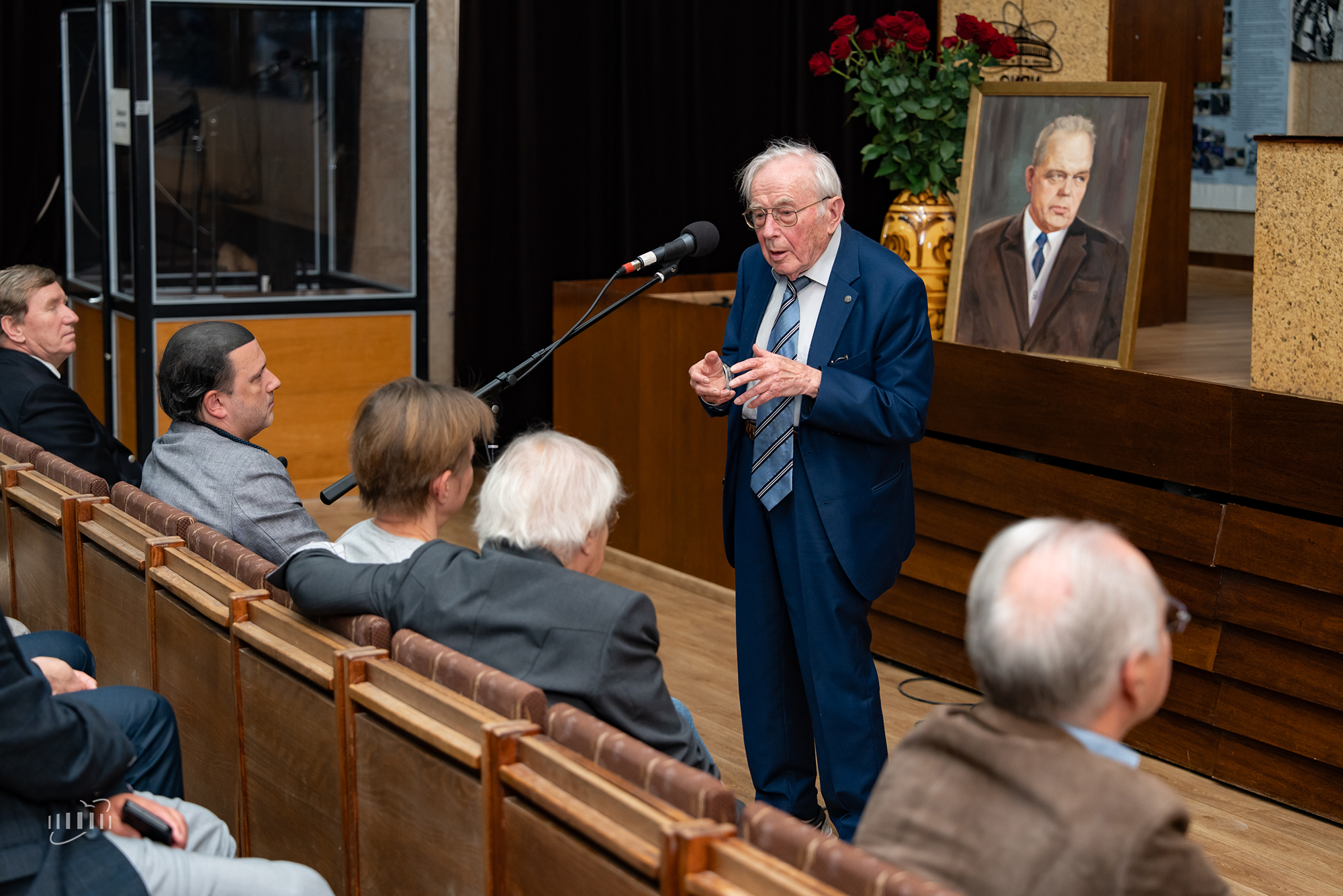 «Михаил Григорьевич Мещеряков – человек-легенда, о котором можно говорить бесконечно, ученик Курчатова, основатель города и один из создателей нашего Института. Город начинался с него, с той самой Гидротехнической лаборатории, которую ему было поручено возглавить. Перед этим он участвовал в первых ядерных испытаниях, открыл путь в Америку, сотрудничая с американскими институтами, был одним из первых энтузиастов внедрения в ОИЯИ вычислительной техники и автоматизированной обработки экспериментальных данных», — напомнил о роли и значимости фигуры ученого для ОИЯИ и Дубны вице-директор Института Владимир Кекелидзе.