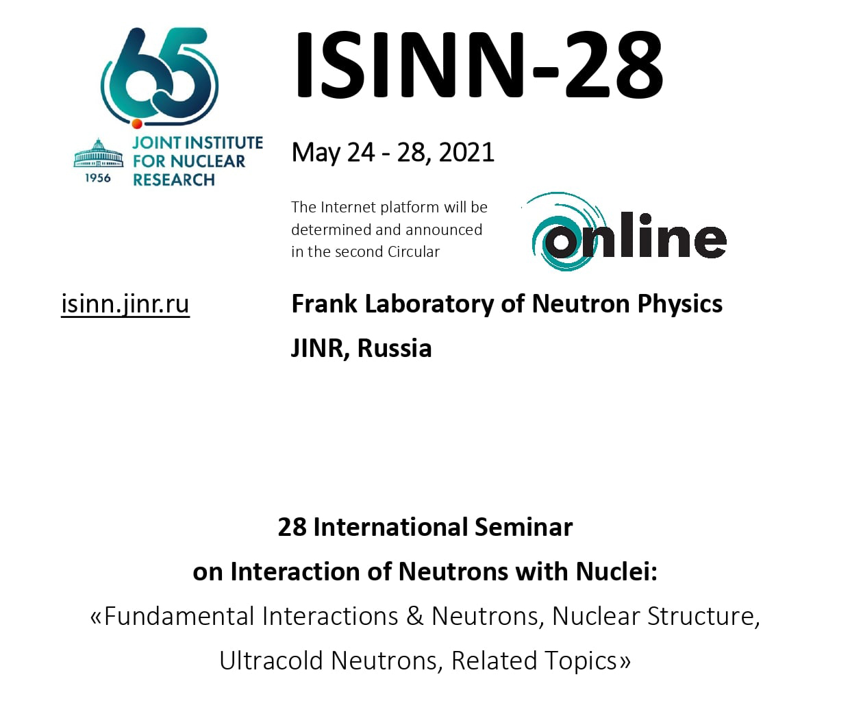 28-й Международный семинар по взаимодействию нейтронов с ядрами ISINN-28 проводится в рамках празднования 65-летия ОИЯИ. Семинар пройдет онлайн 24 — 28 мая 2021 г. Платформа для проведения будет определена позднее и анонсирована в следующем информационном сообщении.