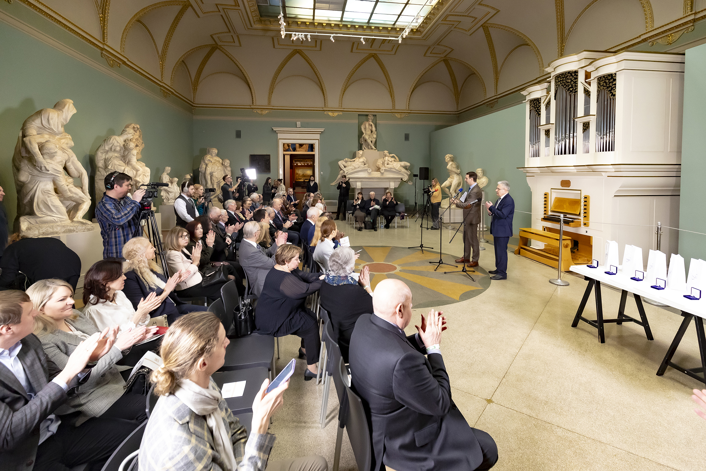 JINR Director, RAS Academician Grigory Trubnikov greeted the guests in the Michelangelo Hall of the Moscow State Museum of Fine Arts. He thanked the Russian Ministry of Science and Higher Education, Ministry of Culture, and Ministry of Foreign Affairs, along with the Russian Academy of Sciences and the Directorate of the Pushkin Museum, for their support in hosting the OGANESSON Prize ceremony.