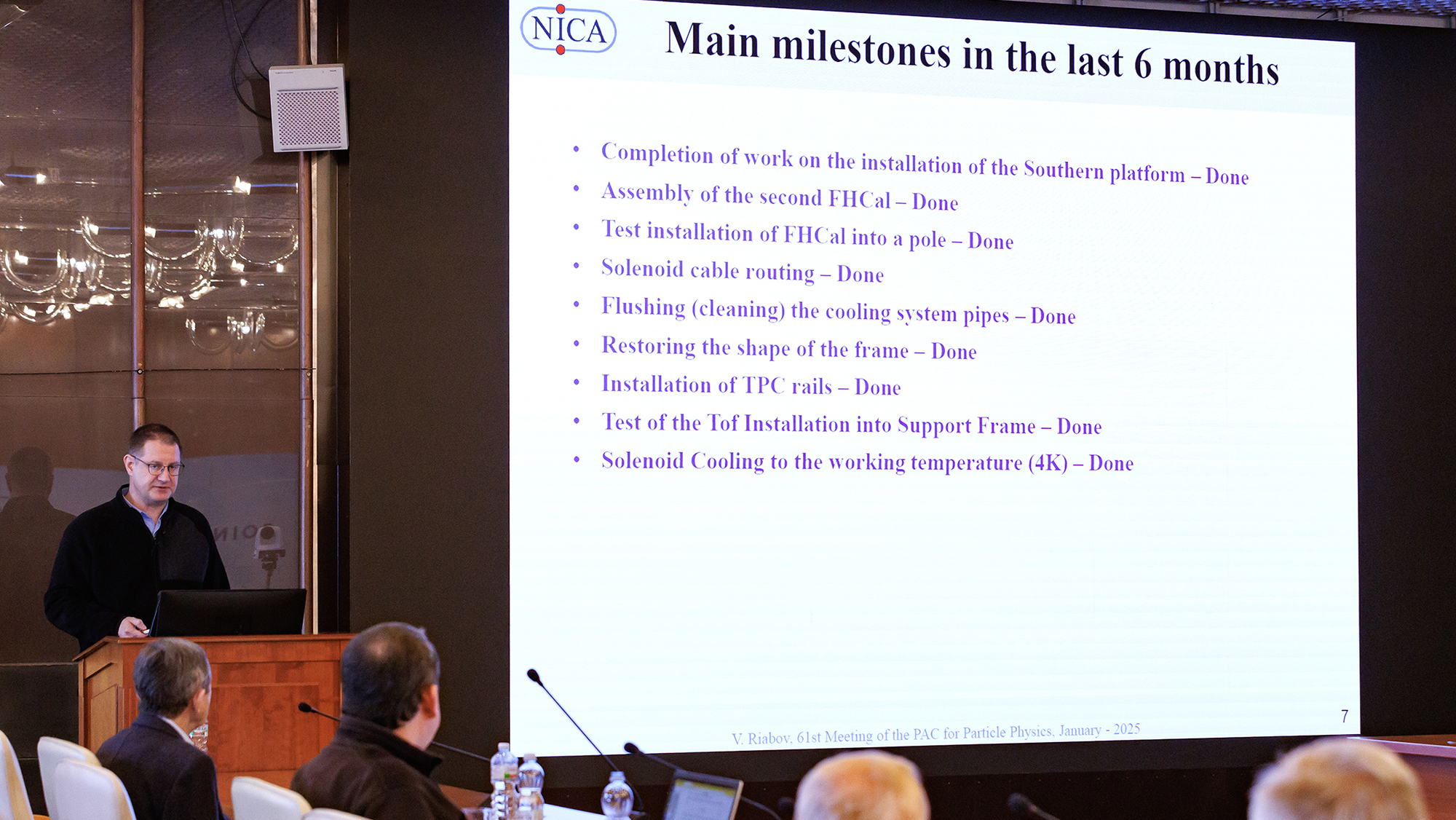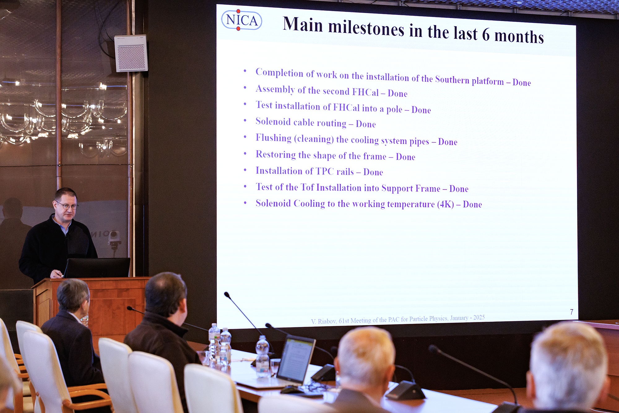 A proposal to continue of the Multipurpose Detector Project and its progress were presented by Chief Researcher at the VBLHEP JINR Sector of Elementary Particle Identification, MPD Collaboration Spokesperson Victor Riabov. As part of the first stage of the experiment, the production of the main elements of all detector subsystems is being completed. At the moment, the following parts were manufactured and are now at the stage of assembly, testing, and adjustment: a carbon fibre support frame, a time-of-flight (TOF) measurement system, a forward hadron calorimeter (FHCal), and a fast forward detector (FFD). In addition, Victor Riabov noted that about 83% of the components of the electromagnetic calorimeter (ECal) are ready. The remaining modules are planned to be prepared by April 2025, after which the assembly of the half-sectors (“baskets”) of the calorimeter and their installation will begin. The assembly and testing of the time projection chamber (TPC) will begin in May, and its installation in the experimental pavilion is scheduled for autumn 2025.