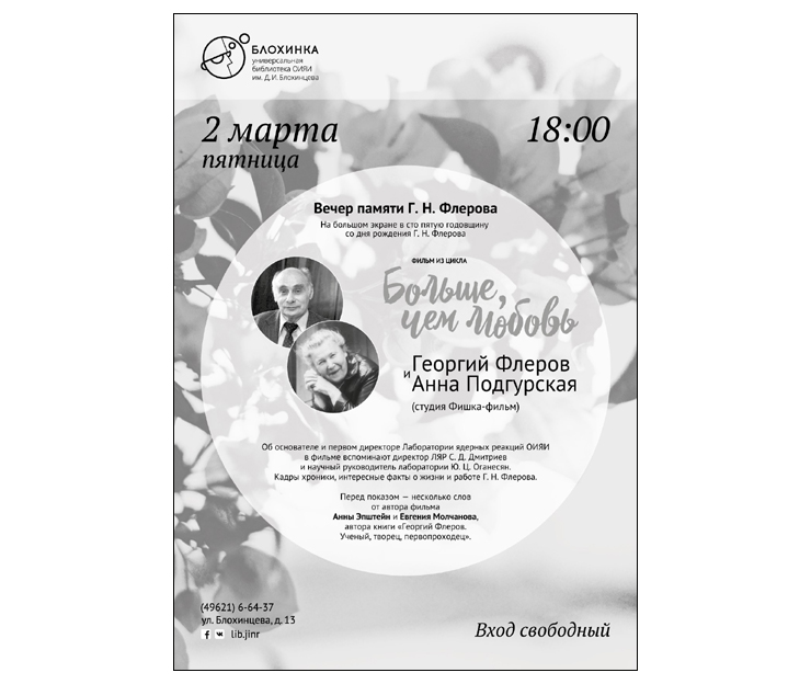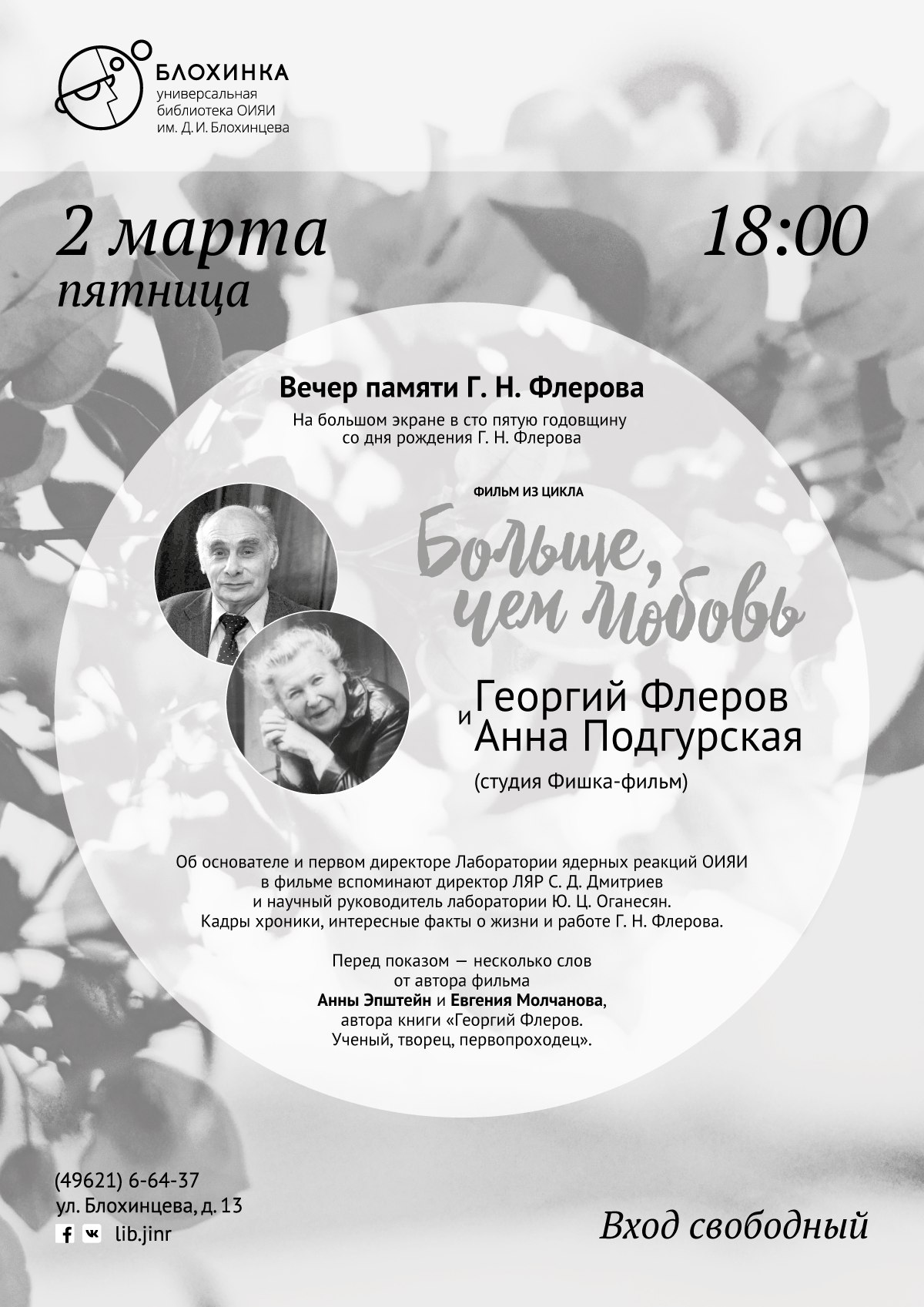 В начале февраля на телеканале «Культура» вышел фильм из серии «Больше, чем любовь»: «Георгий Флеров и Анна Подгурская». Предлагаем посмотреть его на большом экране 2 марта, в сто пятую годовщину со дня рождения Георгия Николаевича.