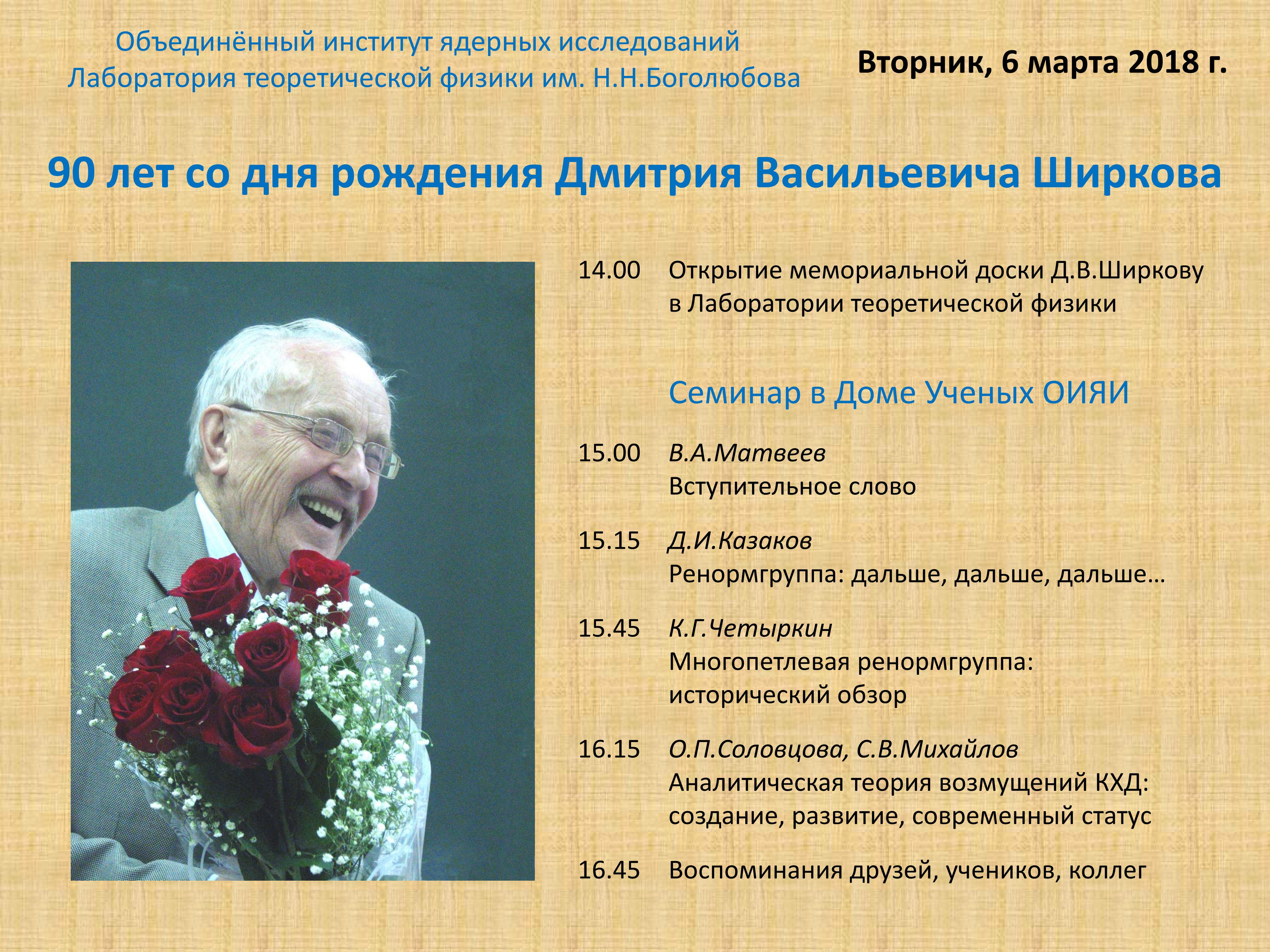 Во вторник, 6 марта 2018 г., Лаборатория теоретической физики им. Н.Н. Боголюбова проводит юбилейный научный семинар, посвященный 90-летию со дня рождения выдающегося российского ученого, всемирно известного физика-теоретика, почетного директора Лаборатории теоретической физики ОИЯИ, академика Дмитрия Васильевича Ширкова (1928 — 2016 гг.).